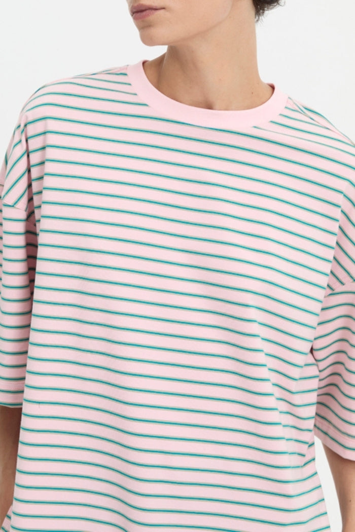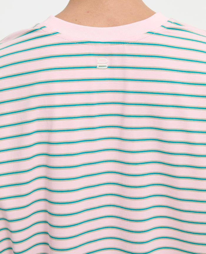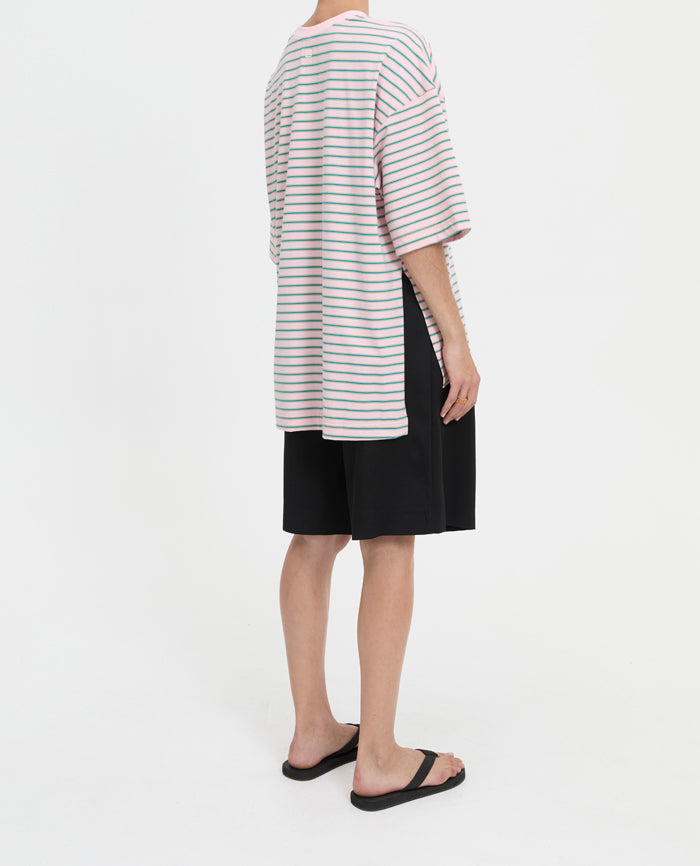 The Maxine Tee is an effortless oversized staple, designed to move seamlessly between lounge and everyday wear. Cut in a relaxed, boxy silhouette with dropped shoulders and wide sleeves, its soft striped fabrication is balanced by a clean ribbed neckline and tonal embroidered logo. Finished with a high-low hem and delicate side splits, it’s designed to pair seamlessly with the matching Maxine Shorts or styled back with denim for understated polish.