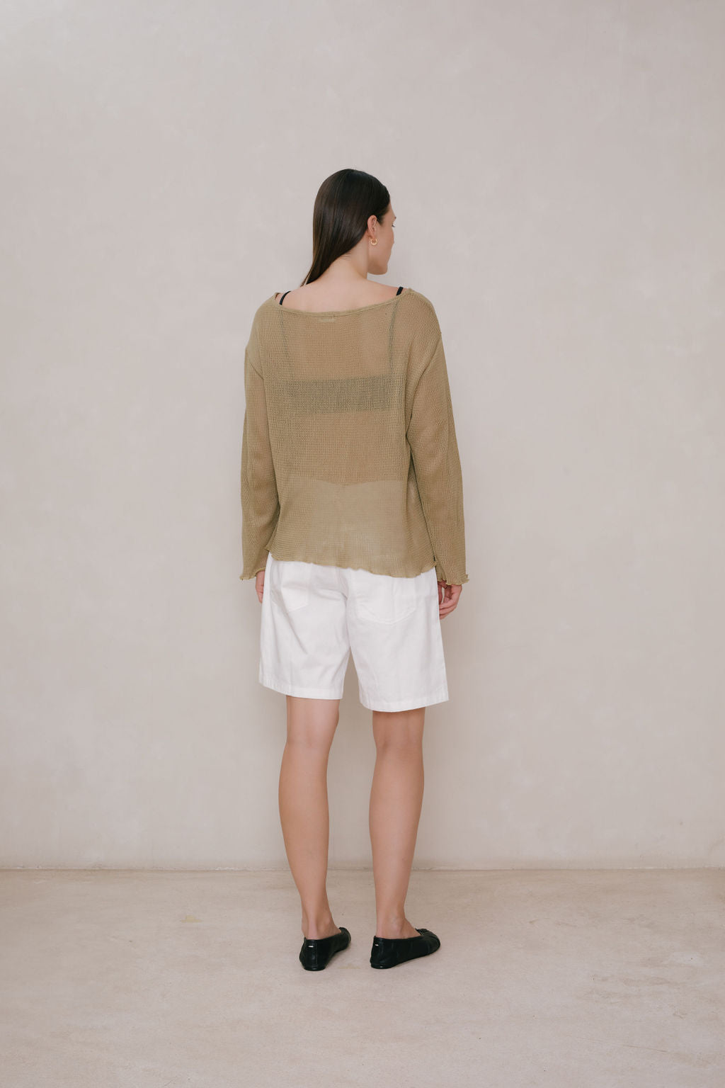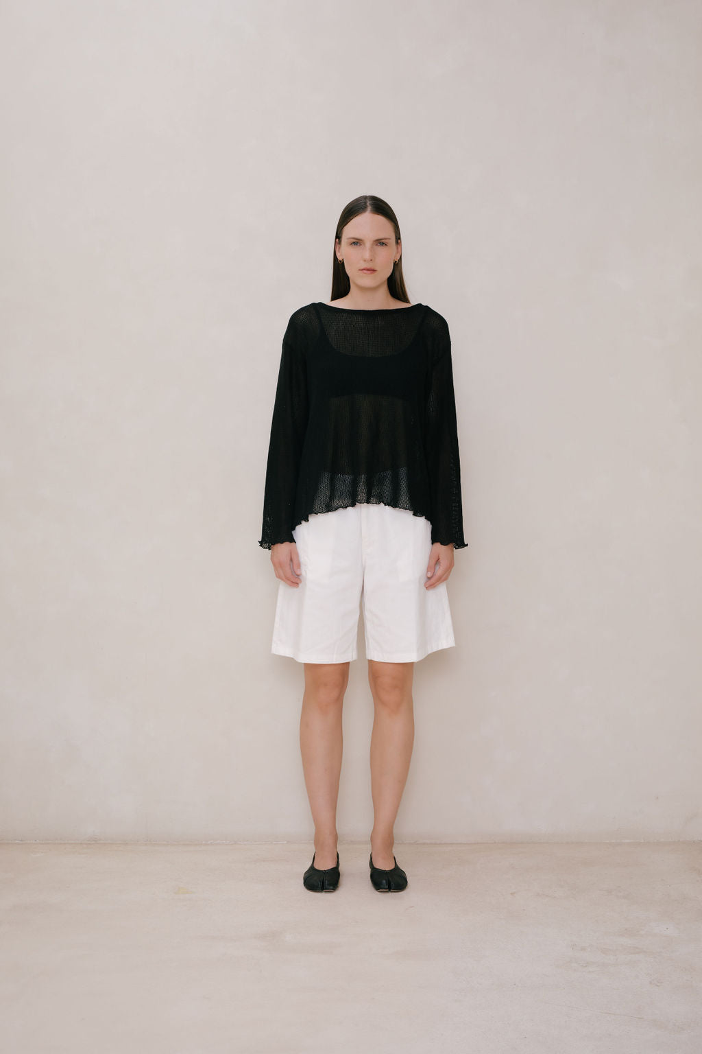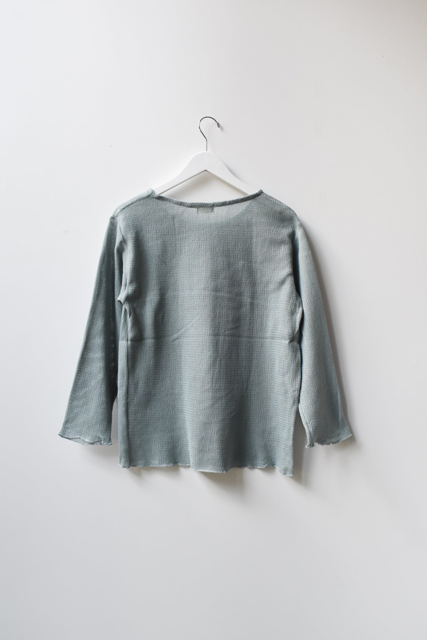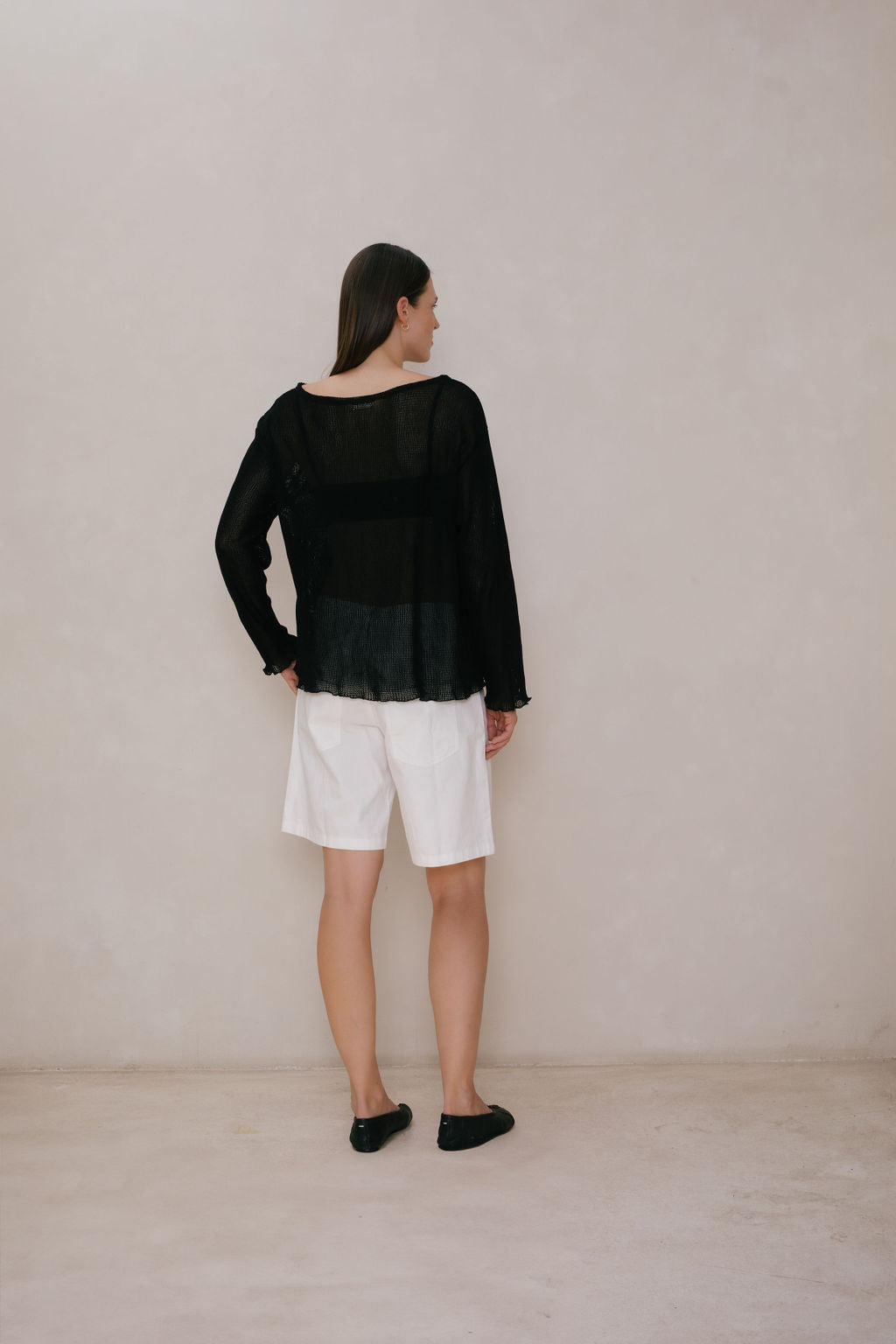 Oversized boatneck long sleeve top, made with sheer mesh cotton knit.