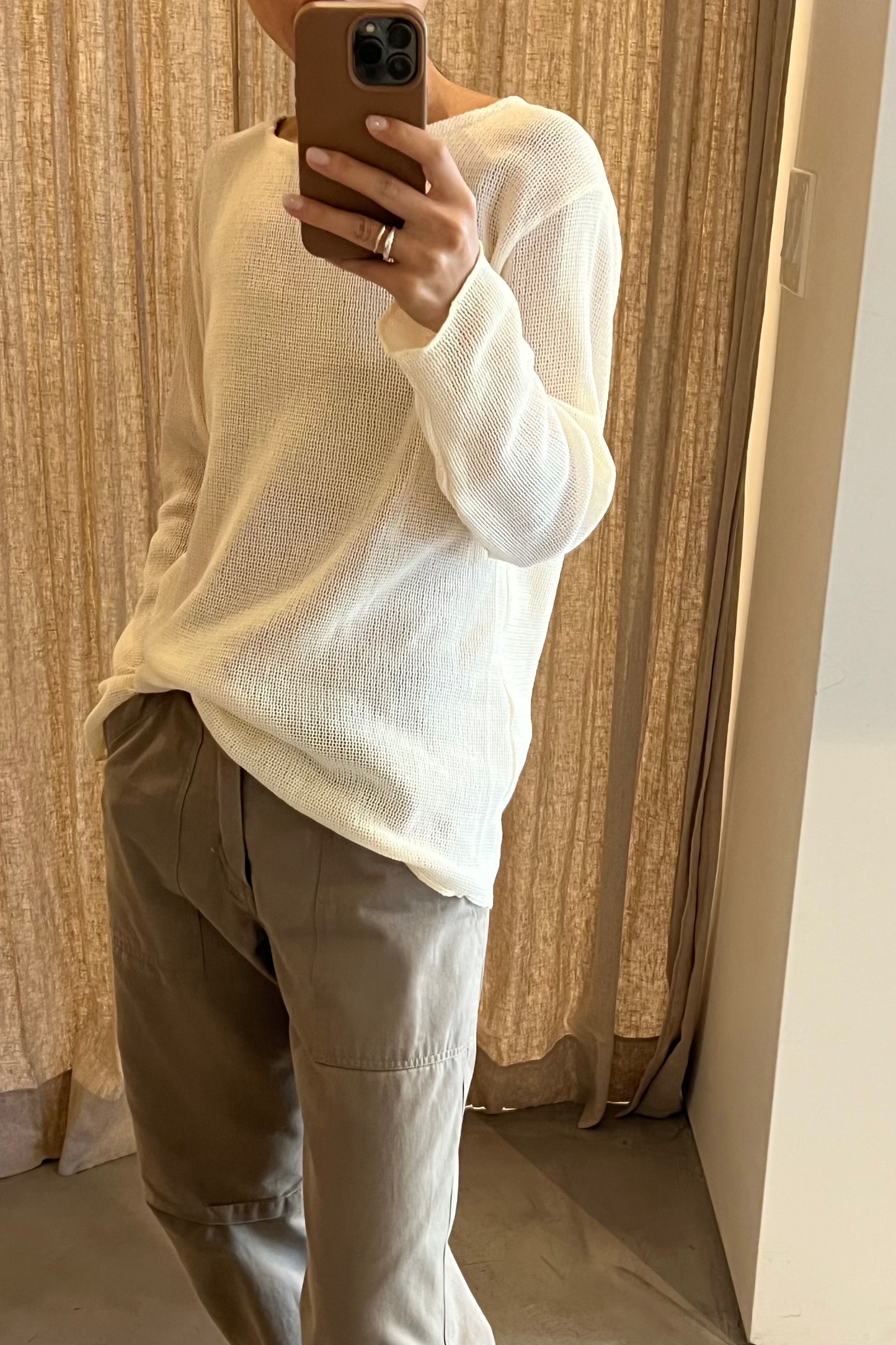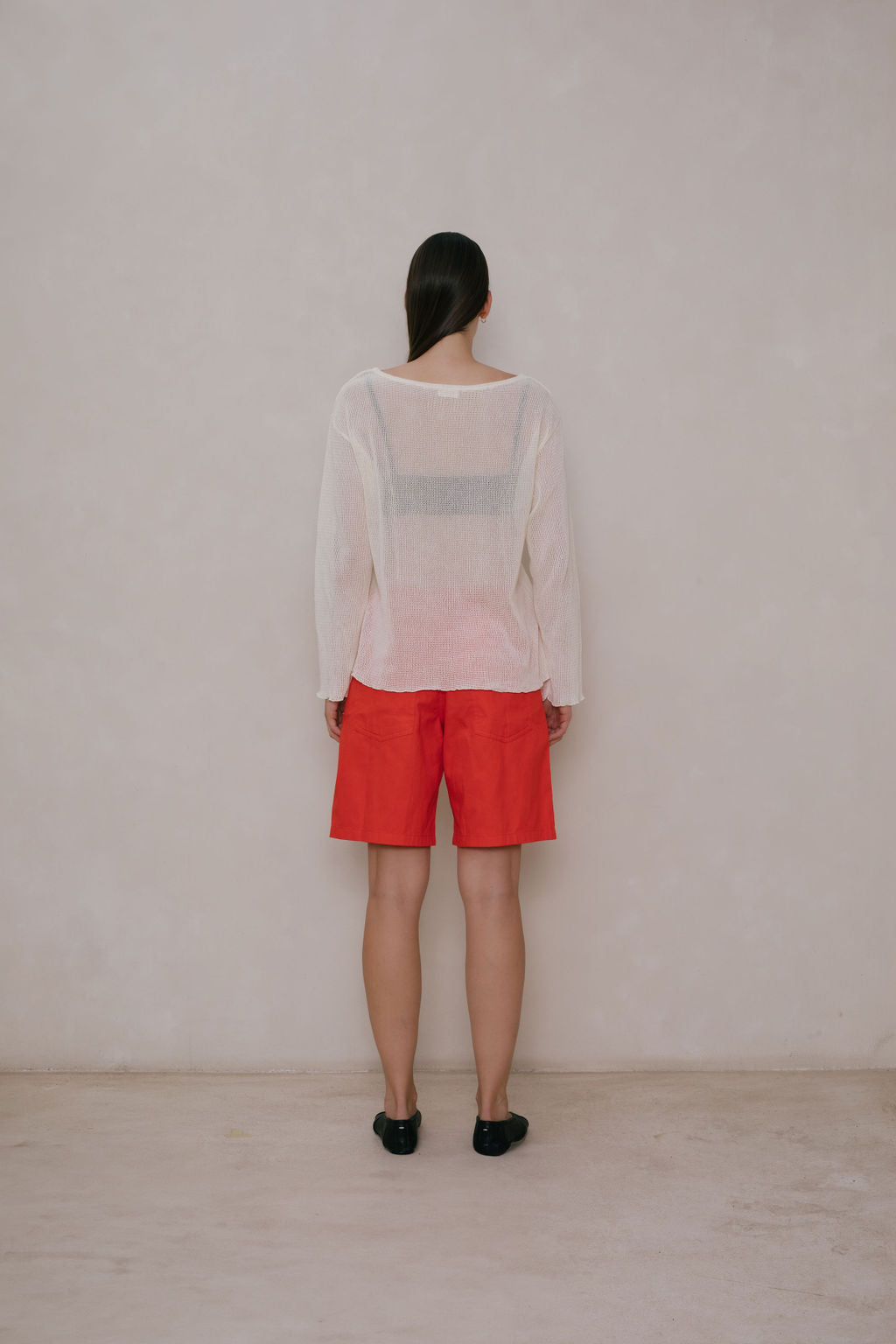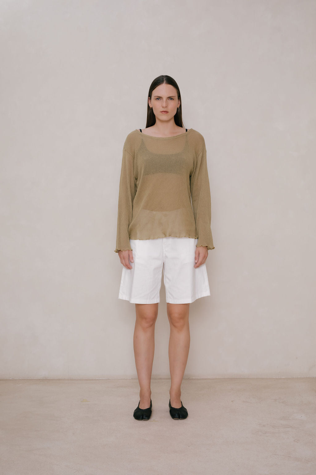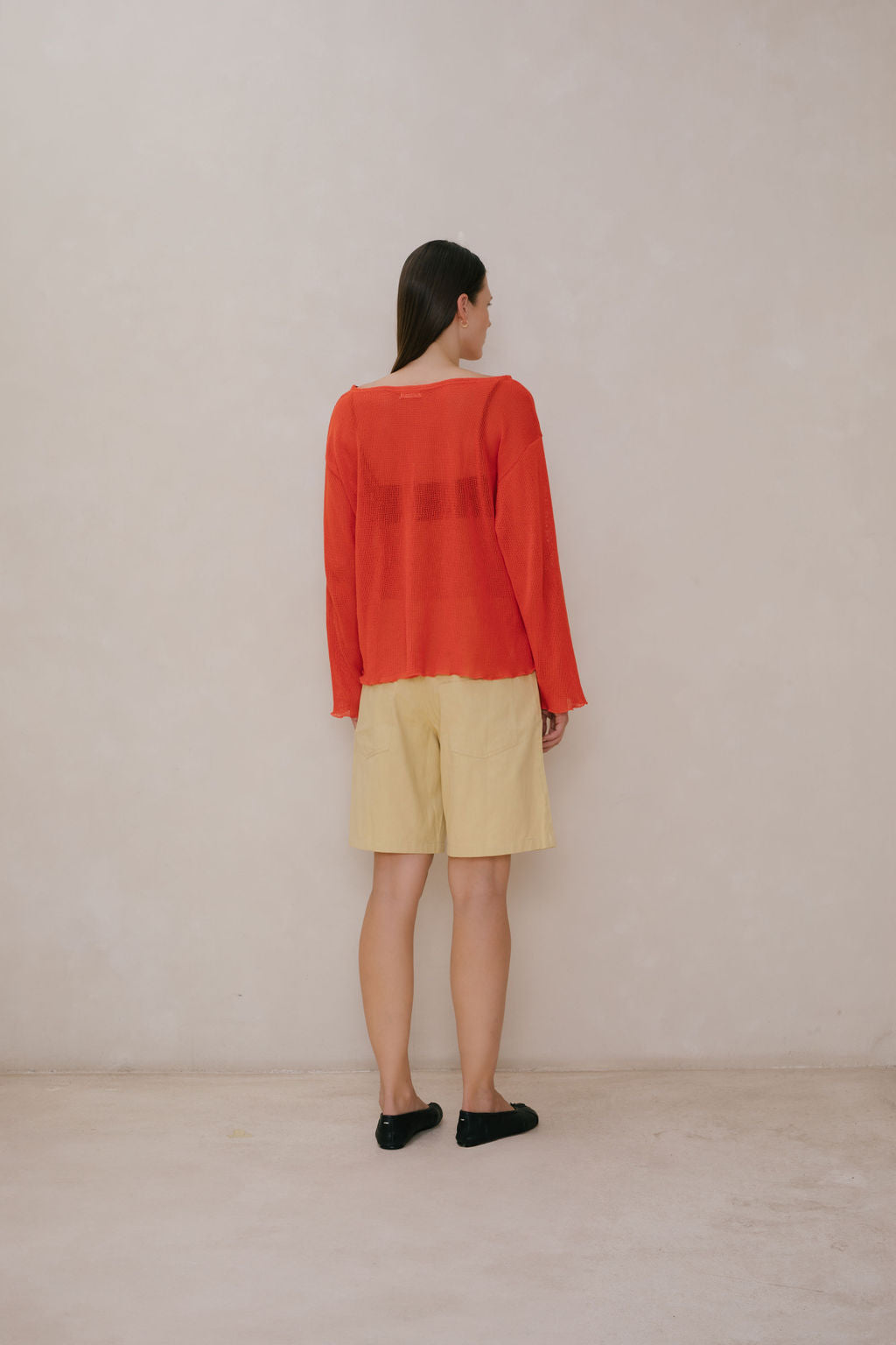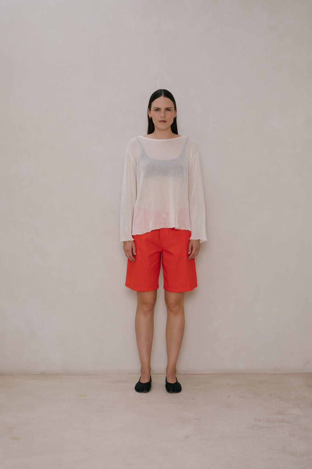 Oversized boatneck long sleeve top, made with sheer mesh cotton knit.