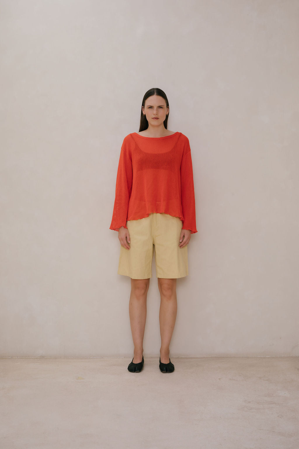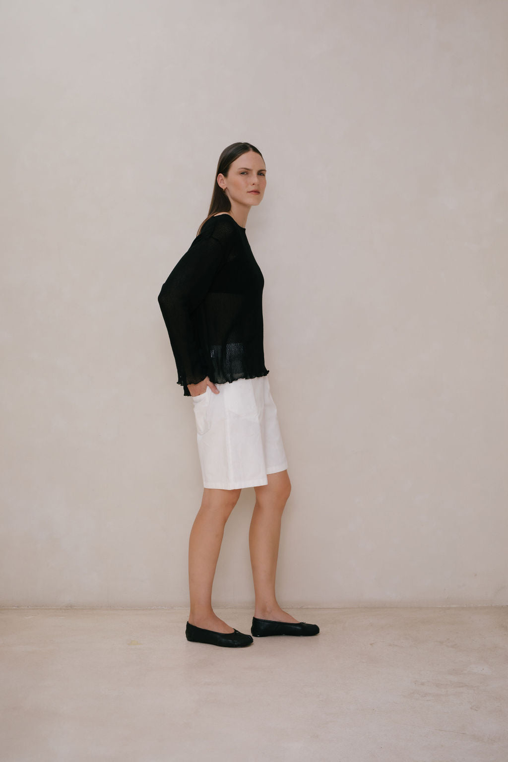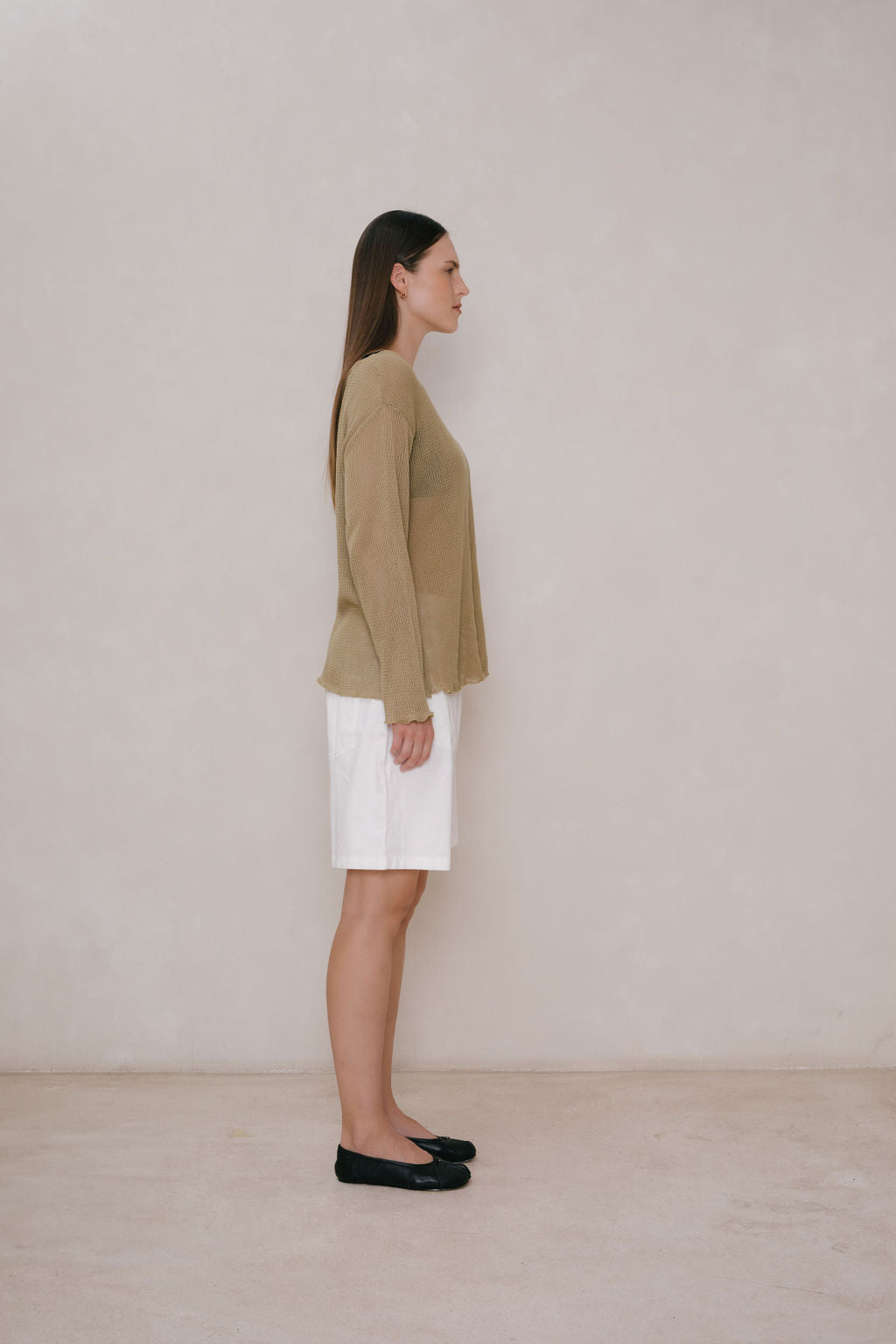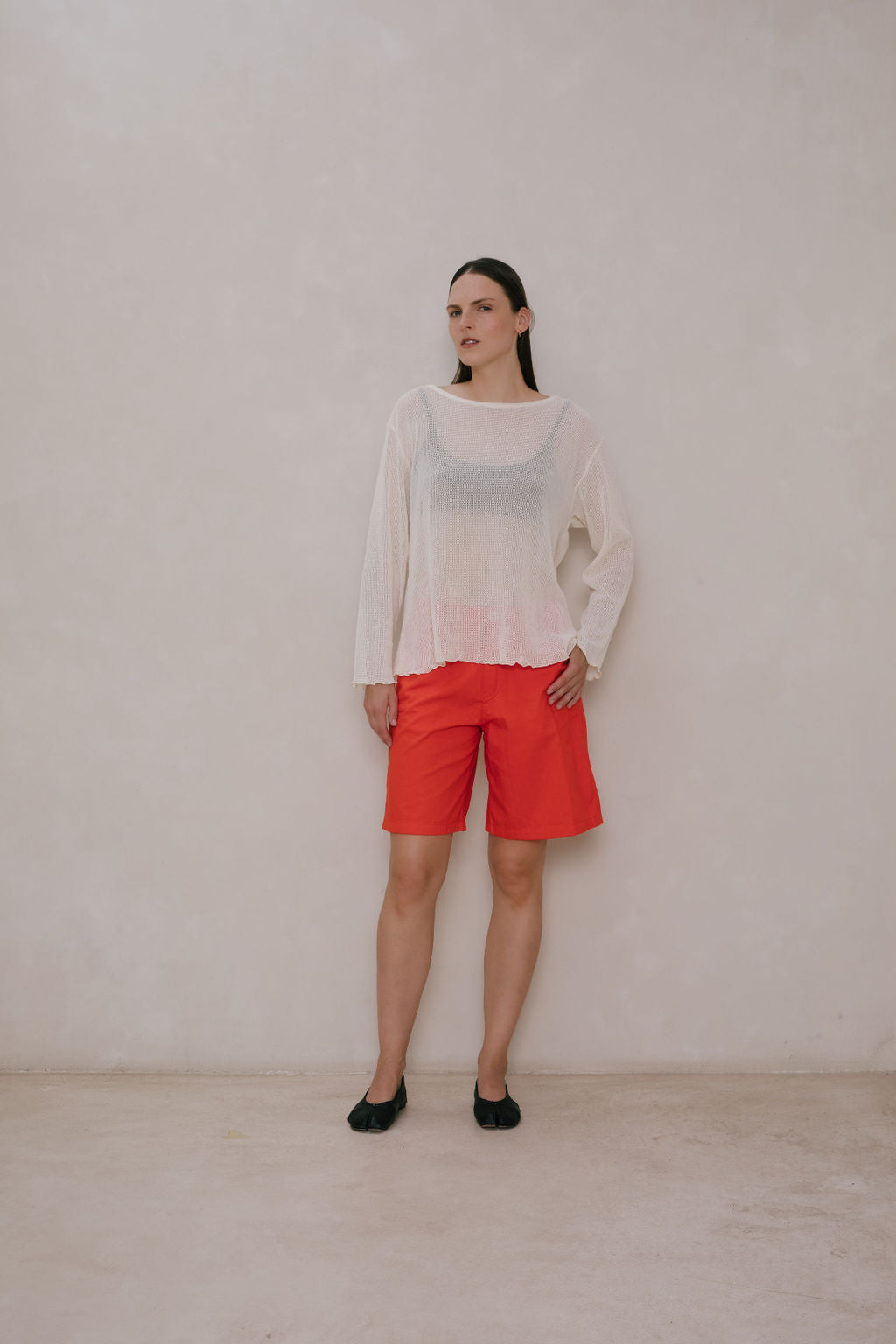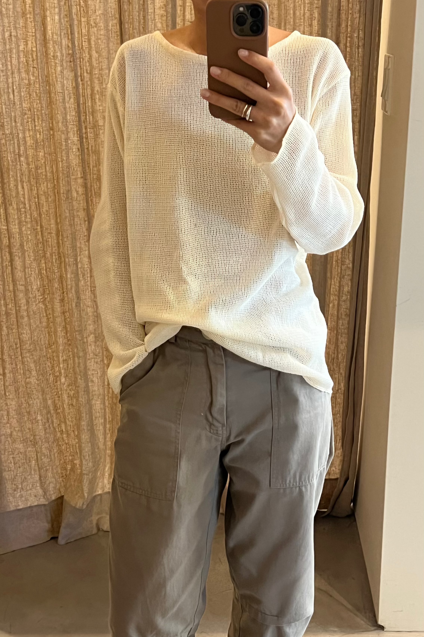 Oversized boatneck long sleeve top, made with sheer mesh cotton knit.