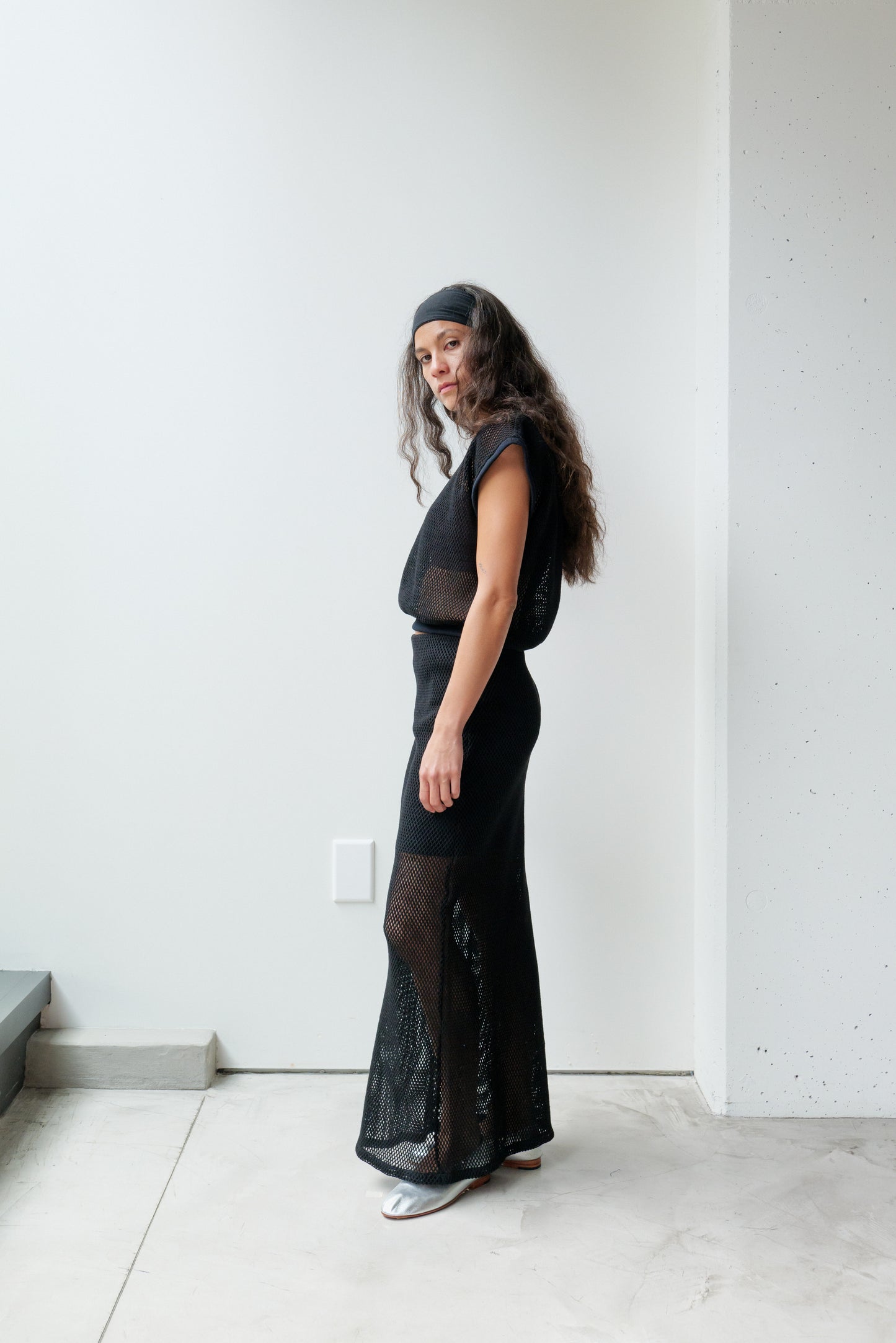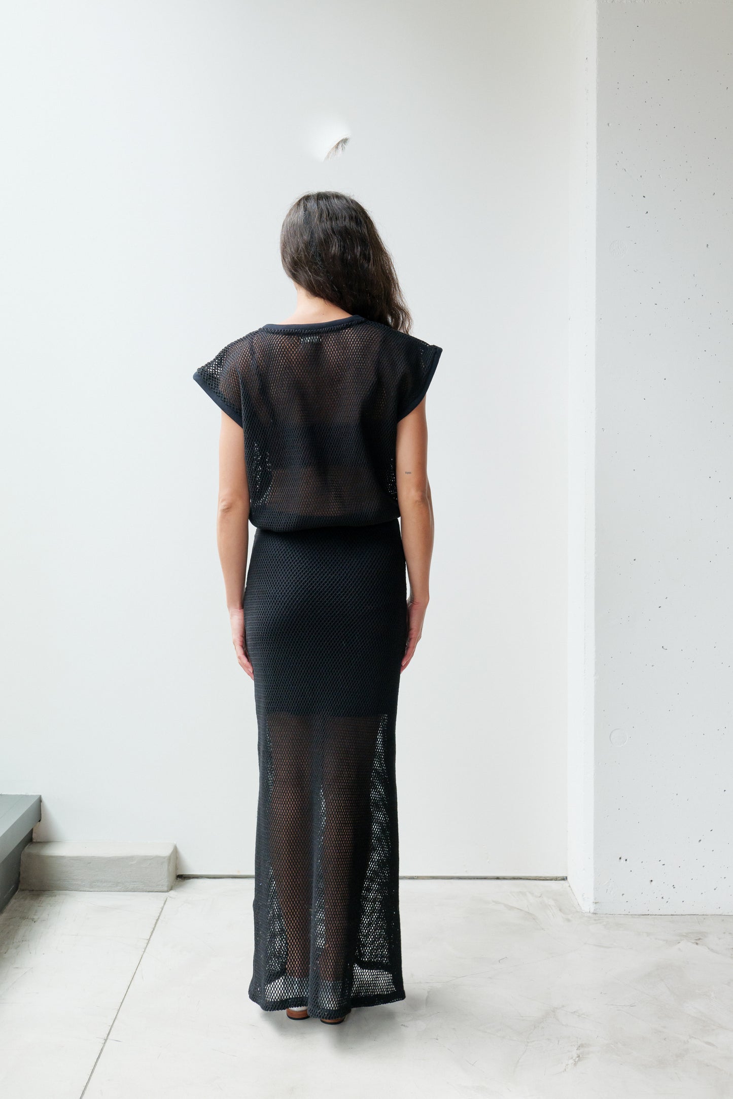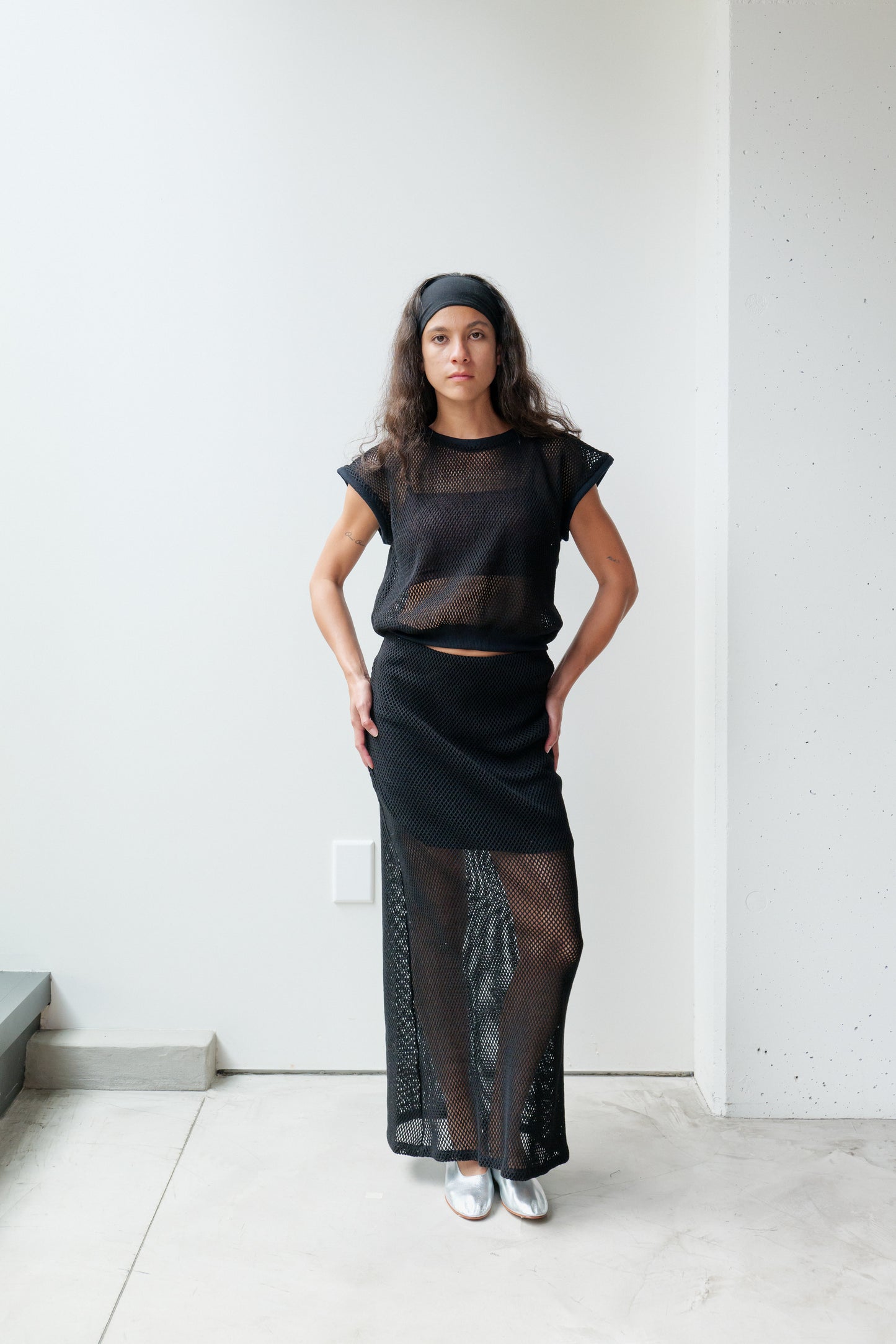 A long mesh skirt with elastic waist and ribbed mini skirt lining. Pair with Mesh Tank Top for a matching set.