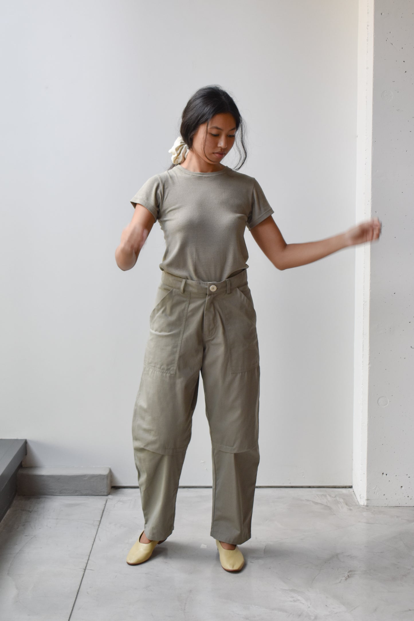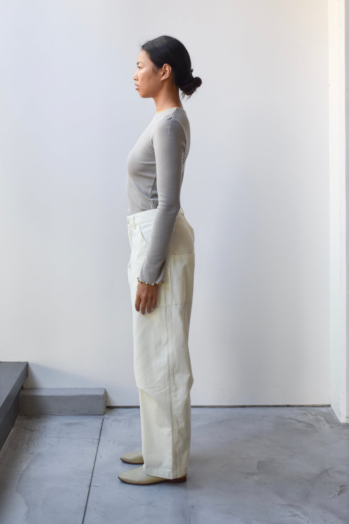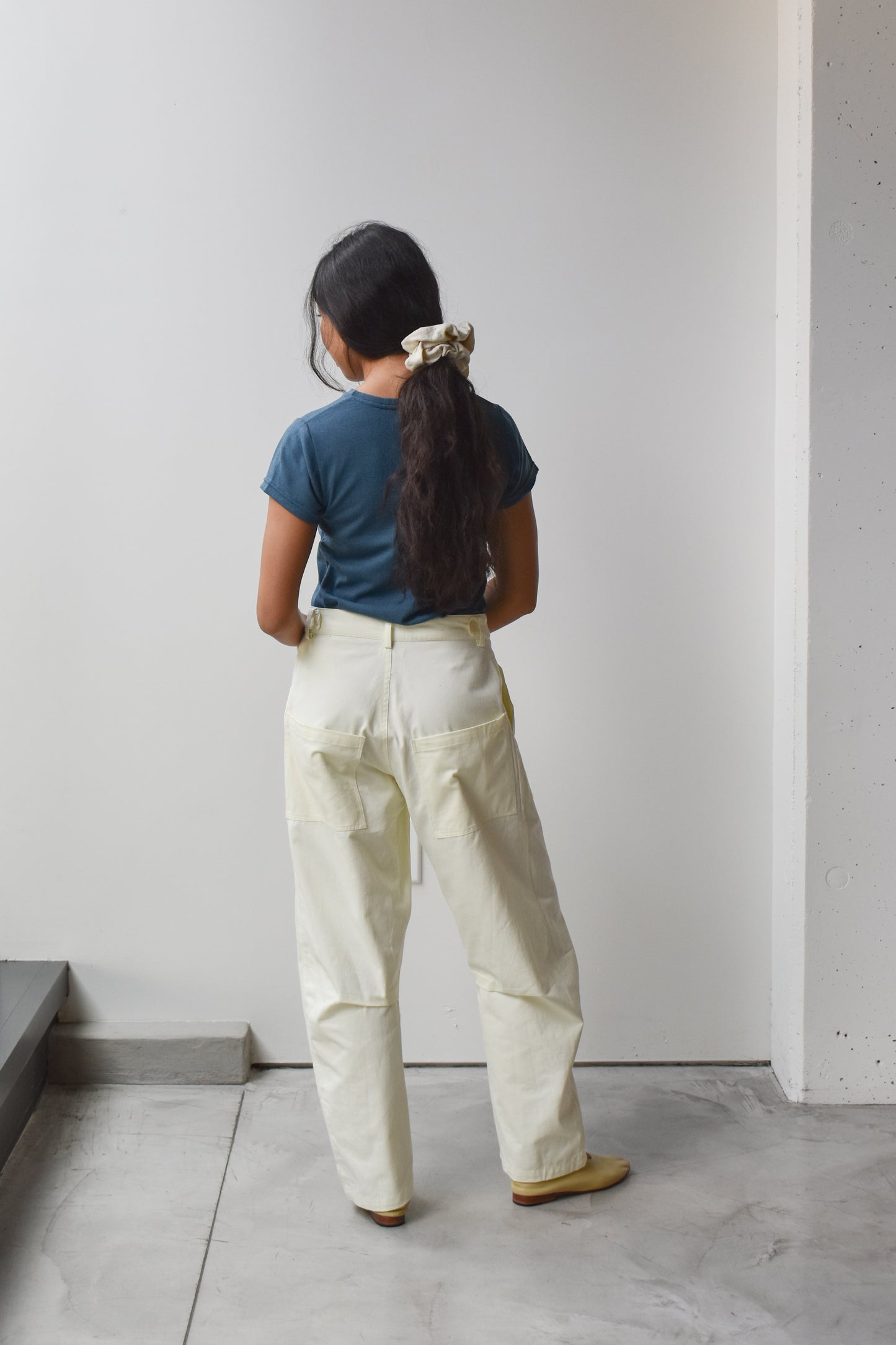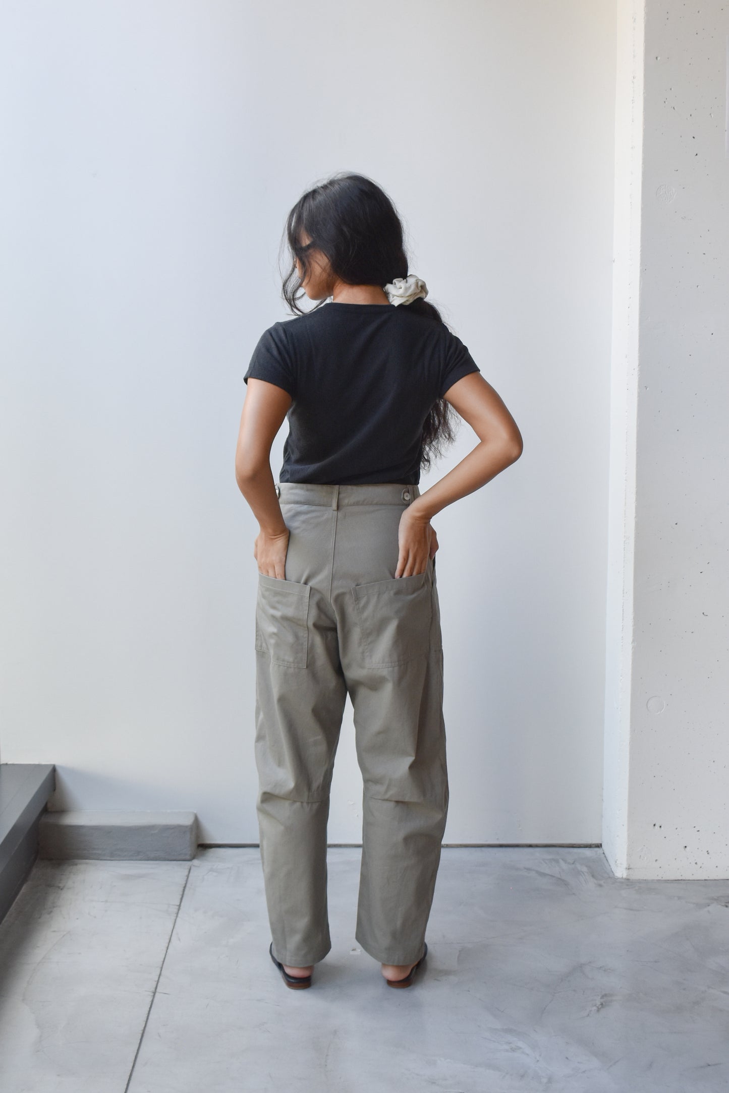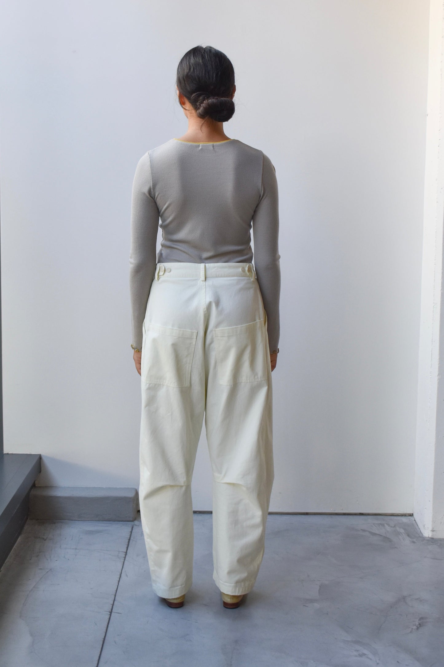 Relaxed fit pant with slightly curved legs, zip fly closure, and side and back pockets. Adjustable button tabs at back waist allow you to style it mid or high rise.