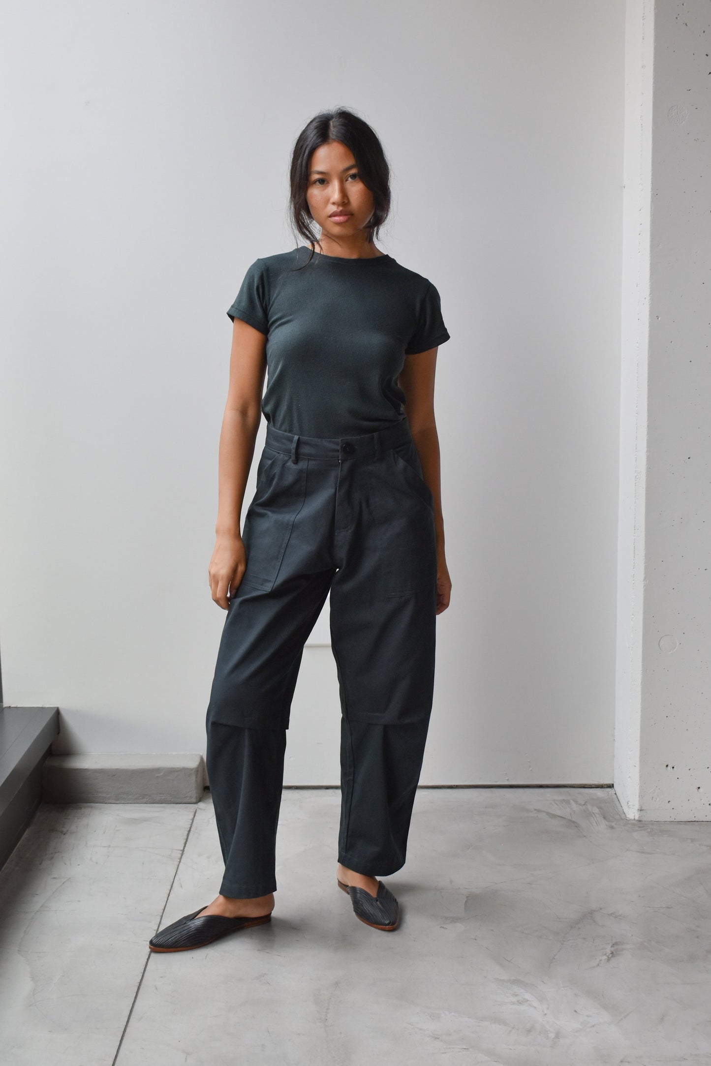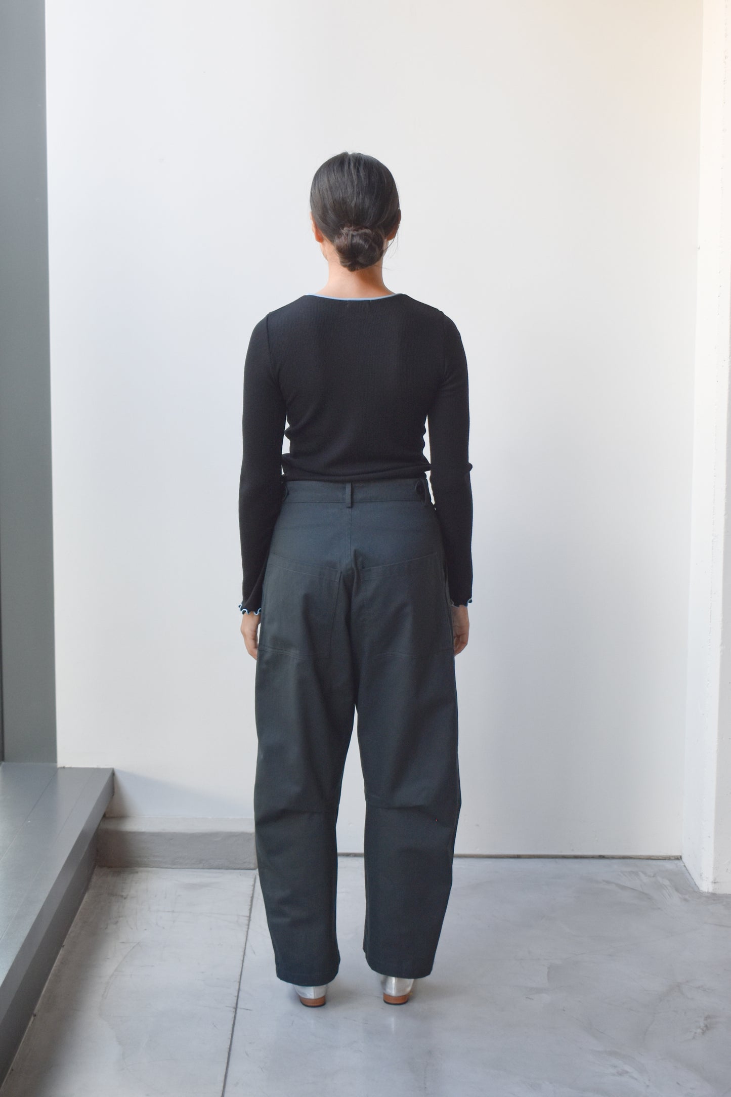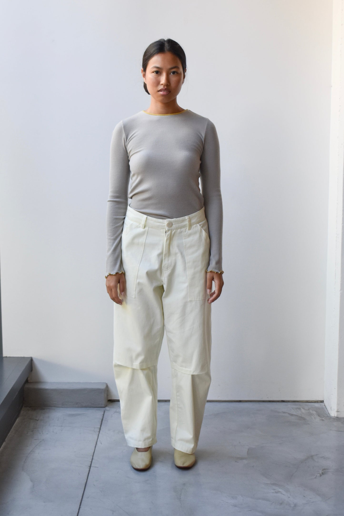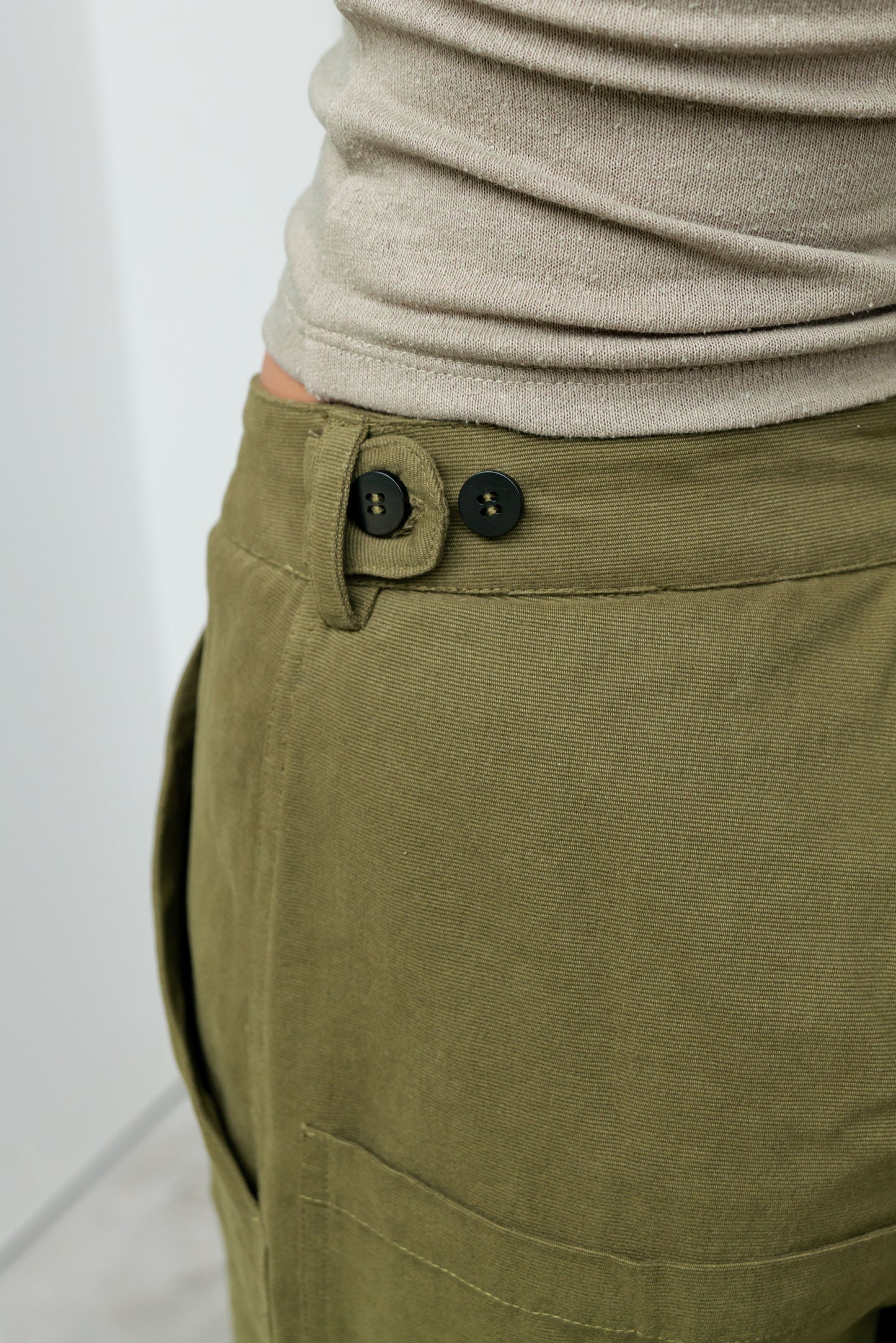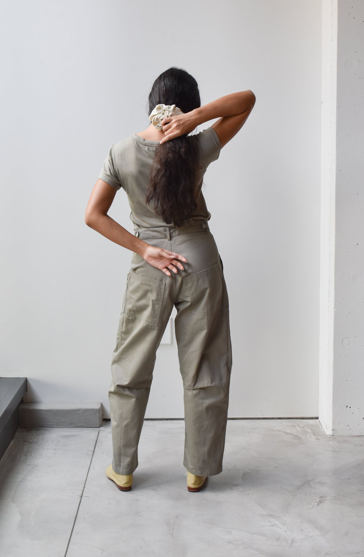 Relaxed fit pant with slightly curved legs, zip fly closure, and side and back pockets. Adjustable button tabs at back waist allow you to style it mid or high rise.