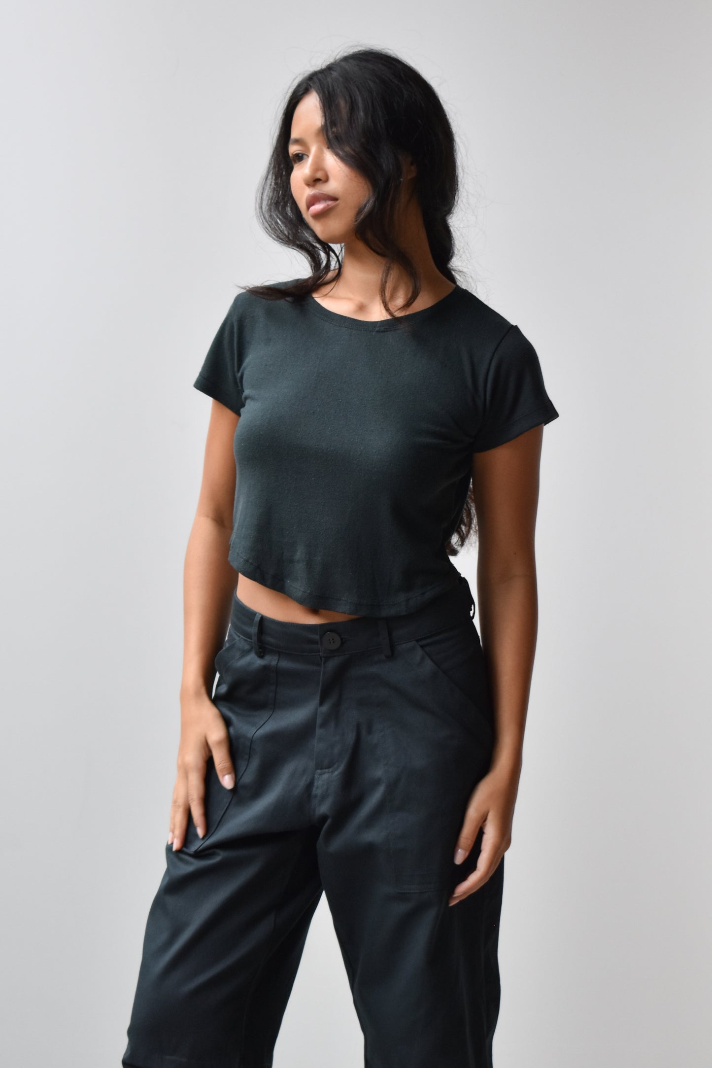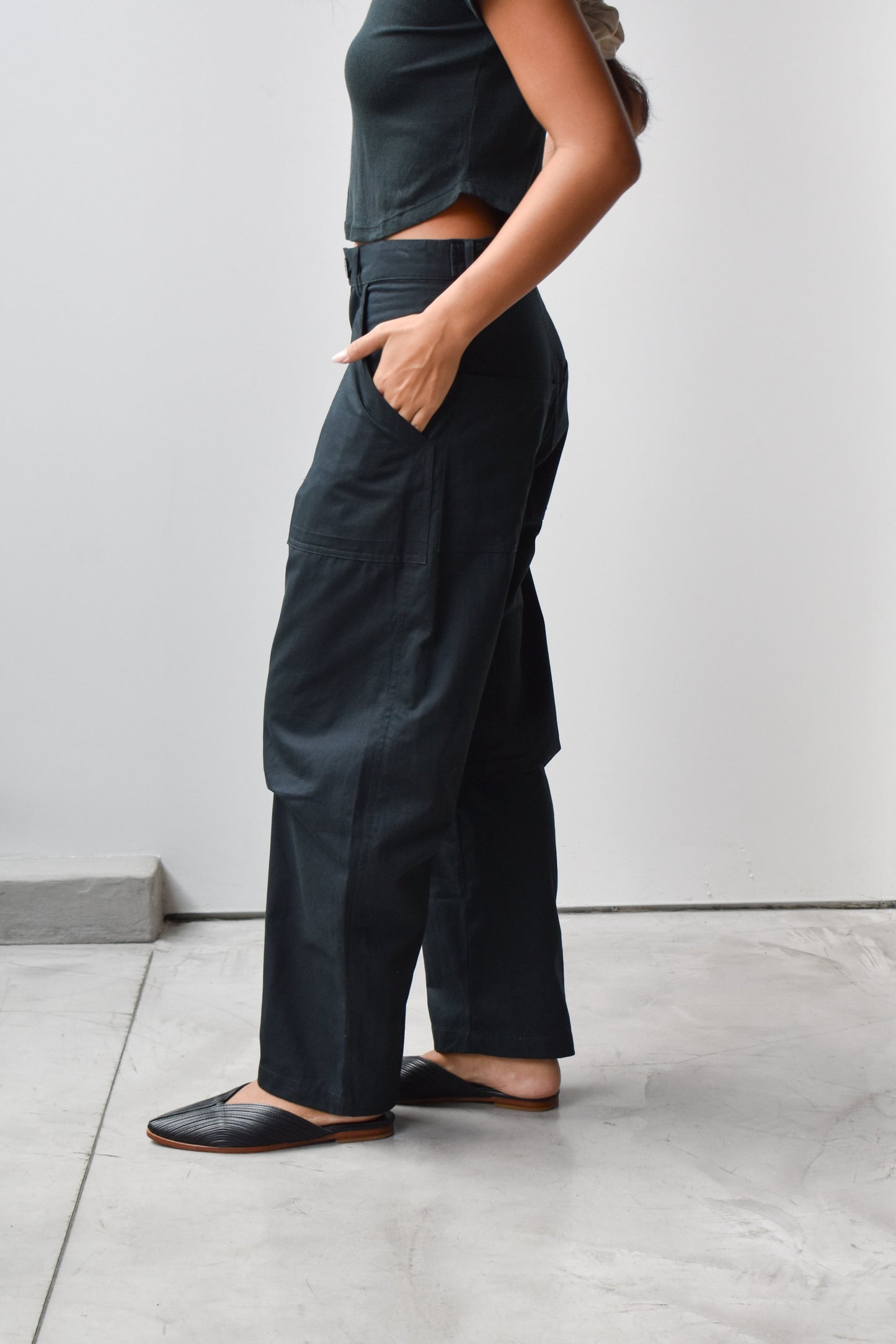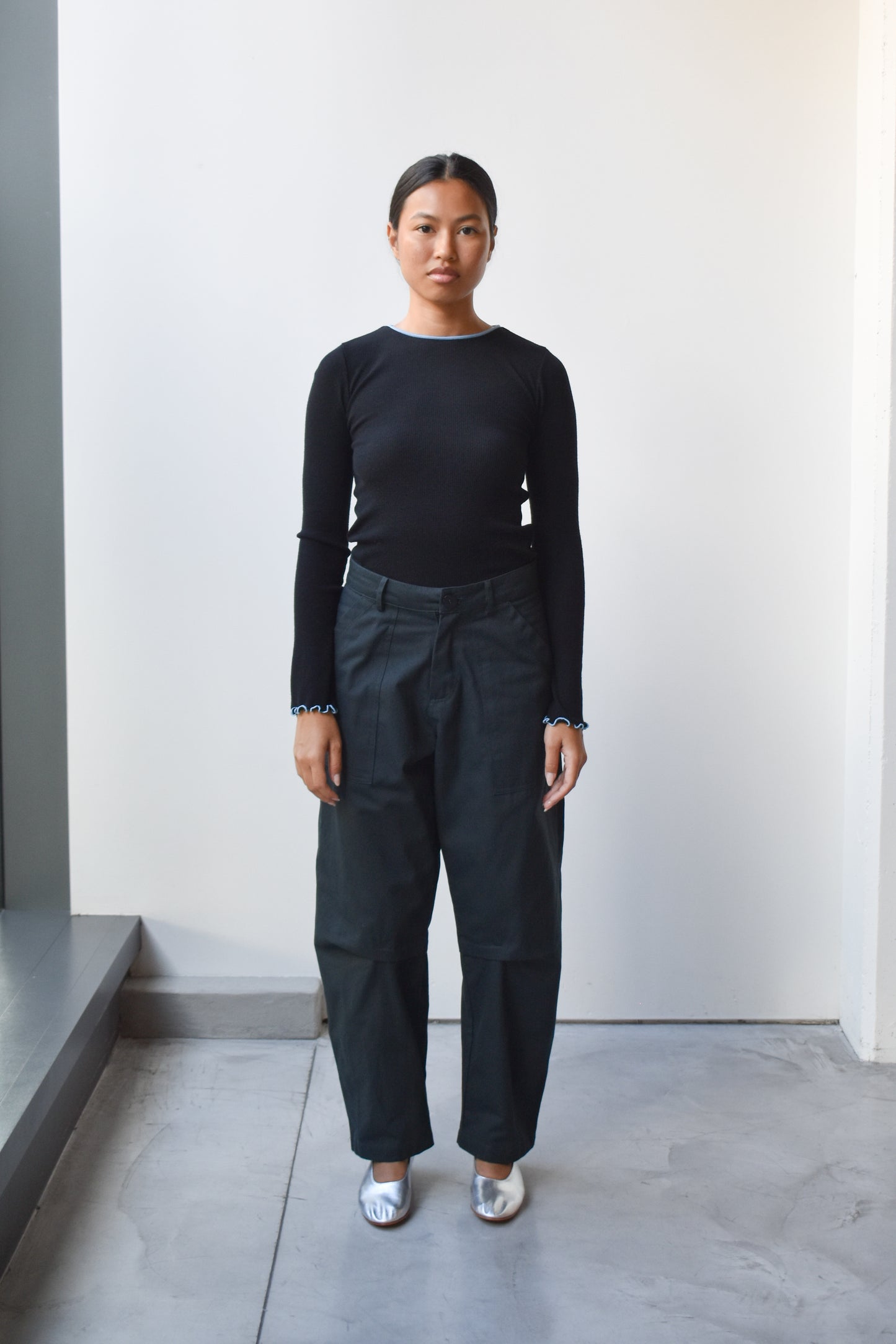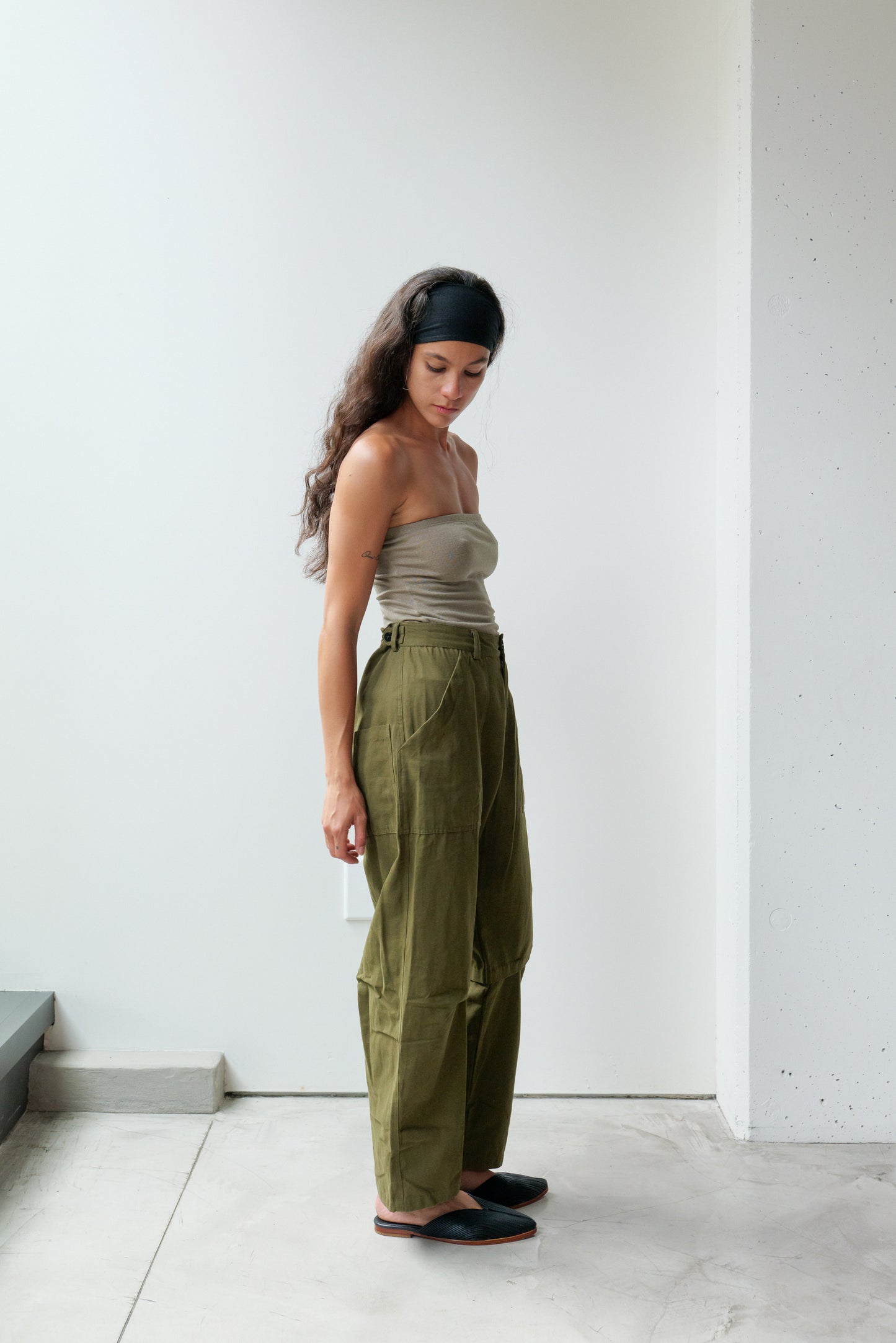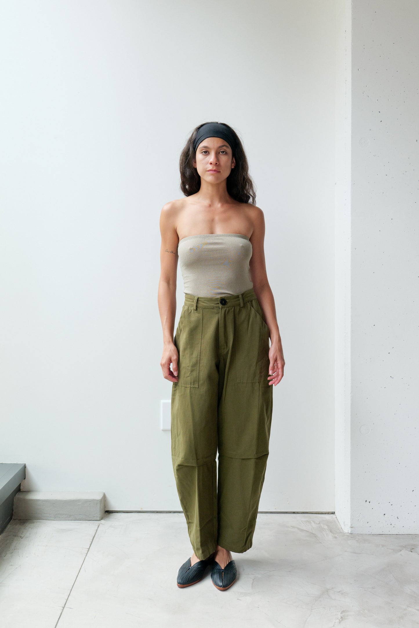 Relaxed fit pant with slightly curved legs, zip fly closure, and side and back pockets. Adjustable button tabs at back waist allow you to style it mid or high rise.