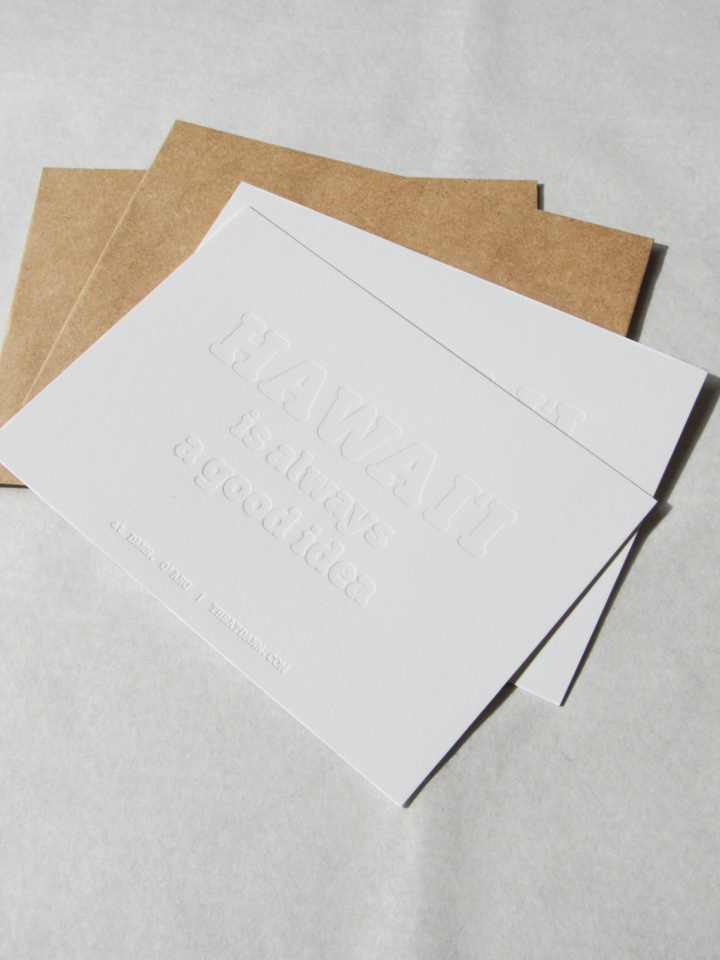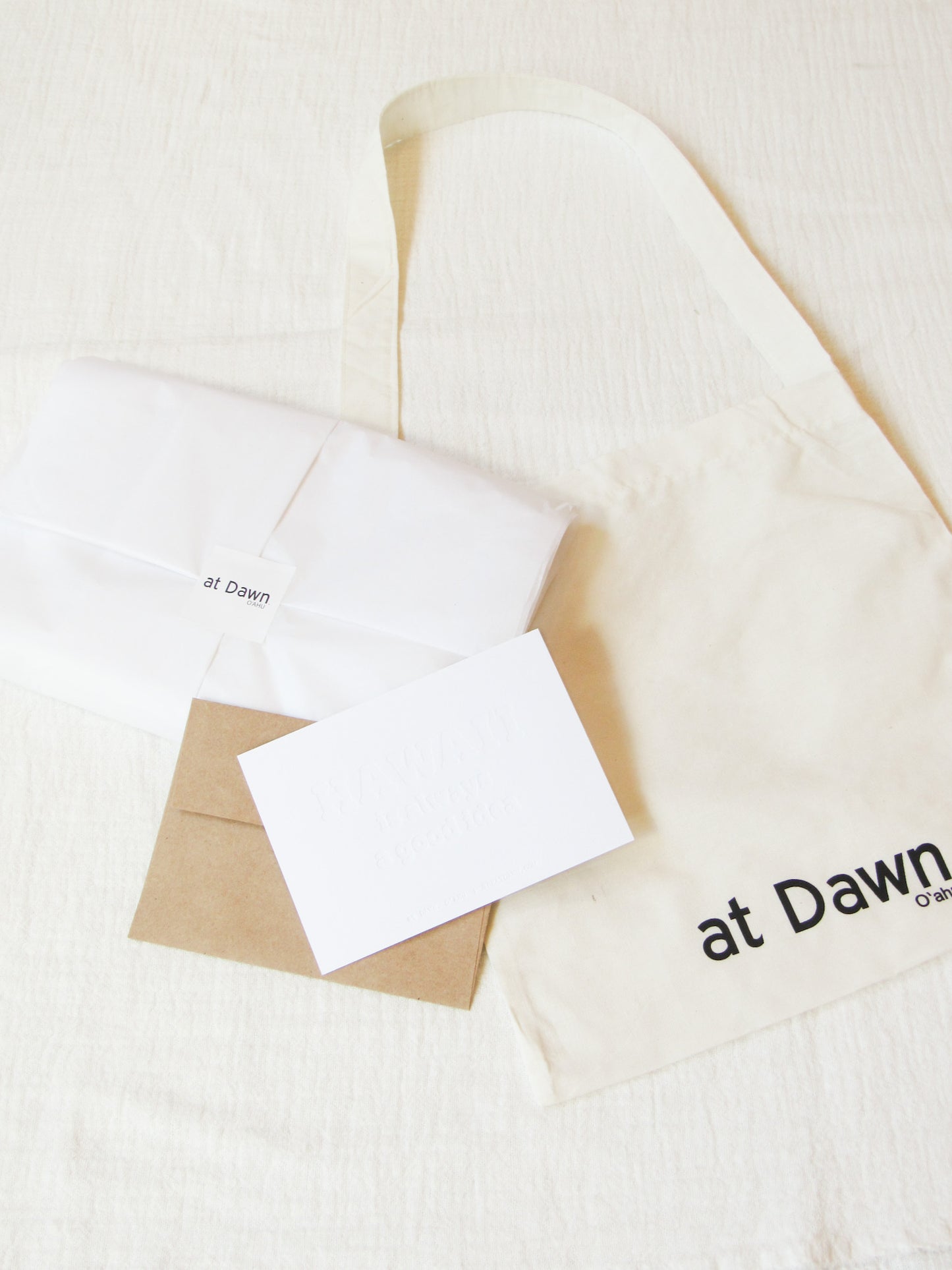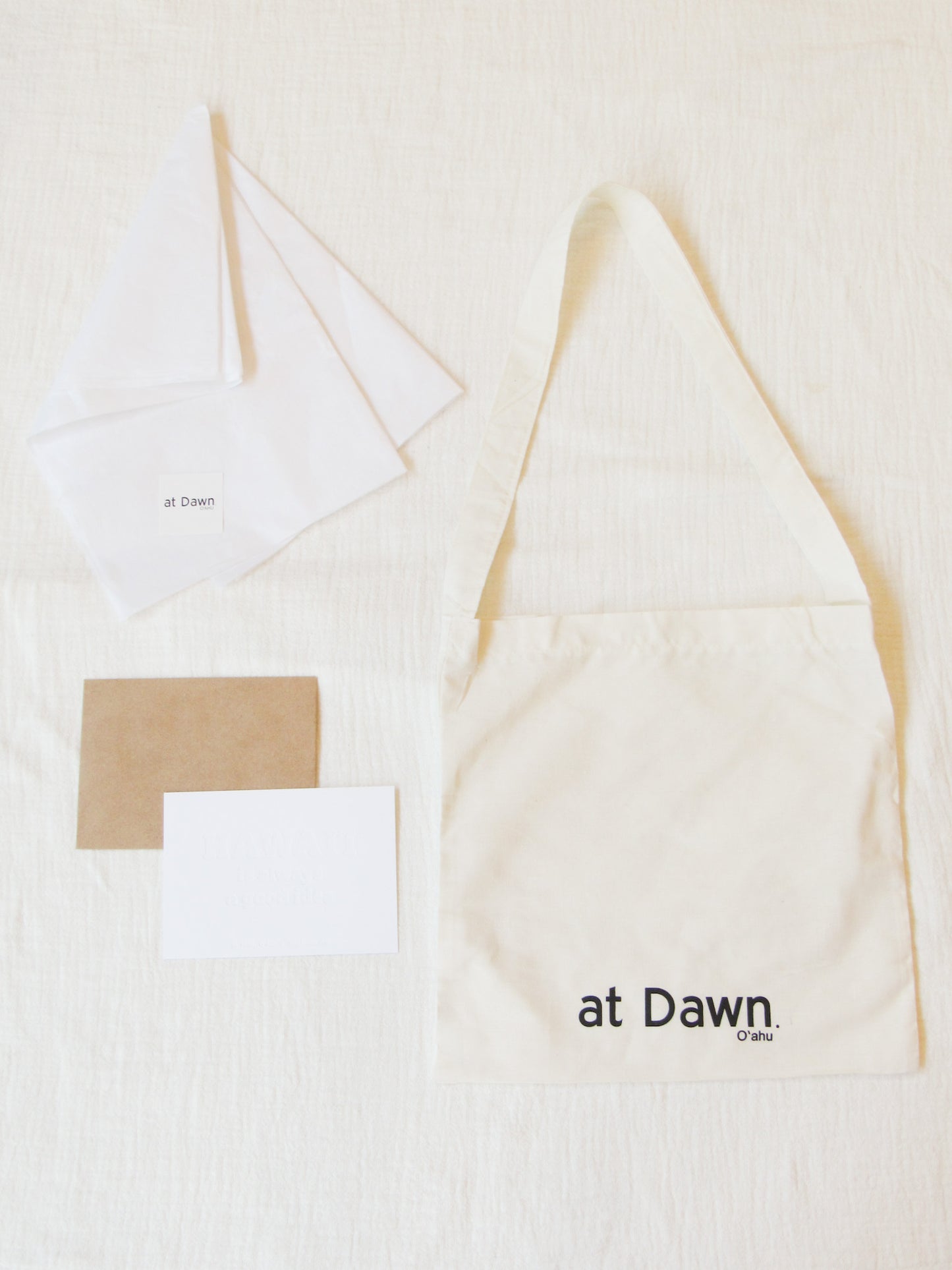 Our gift wrapping kit will come with everything you need to wrap! We will include our hand made Hawaii card with Kraft envelope, tissue paper, sticker label, as well as our At Dawn cotton tote so that you can easily wrap items when you're ready to present them.
