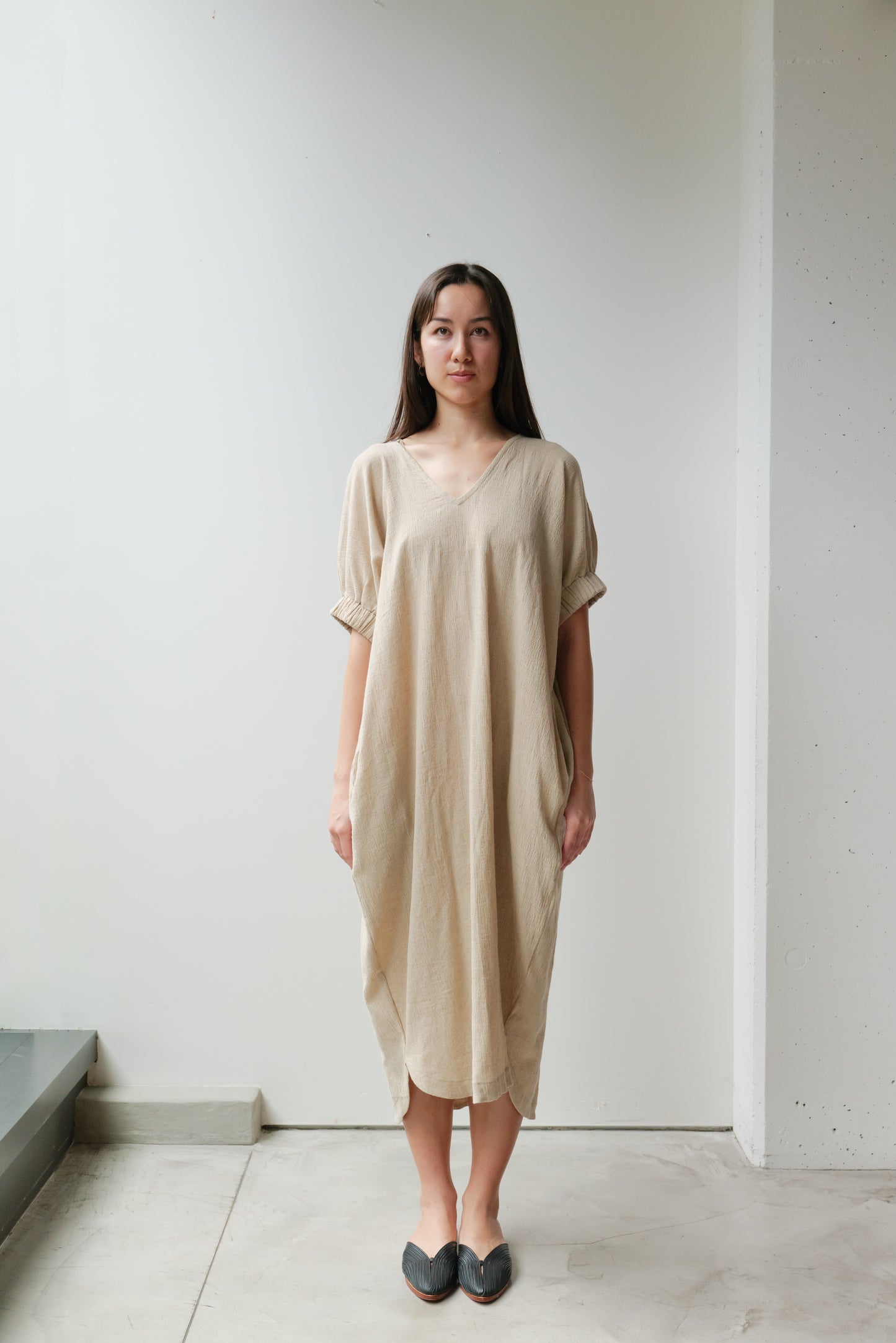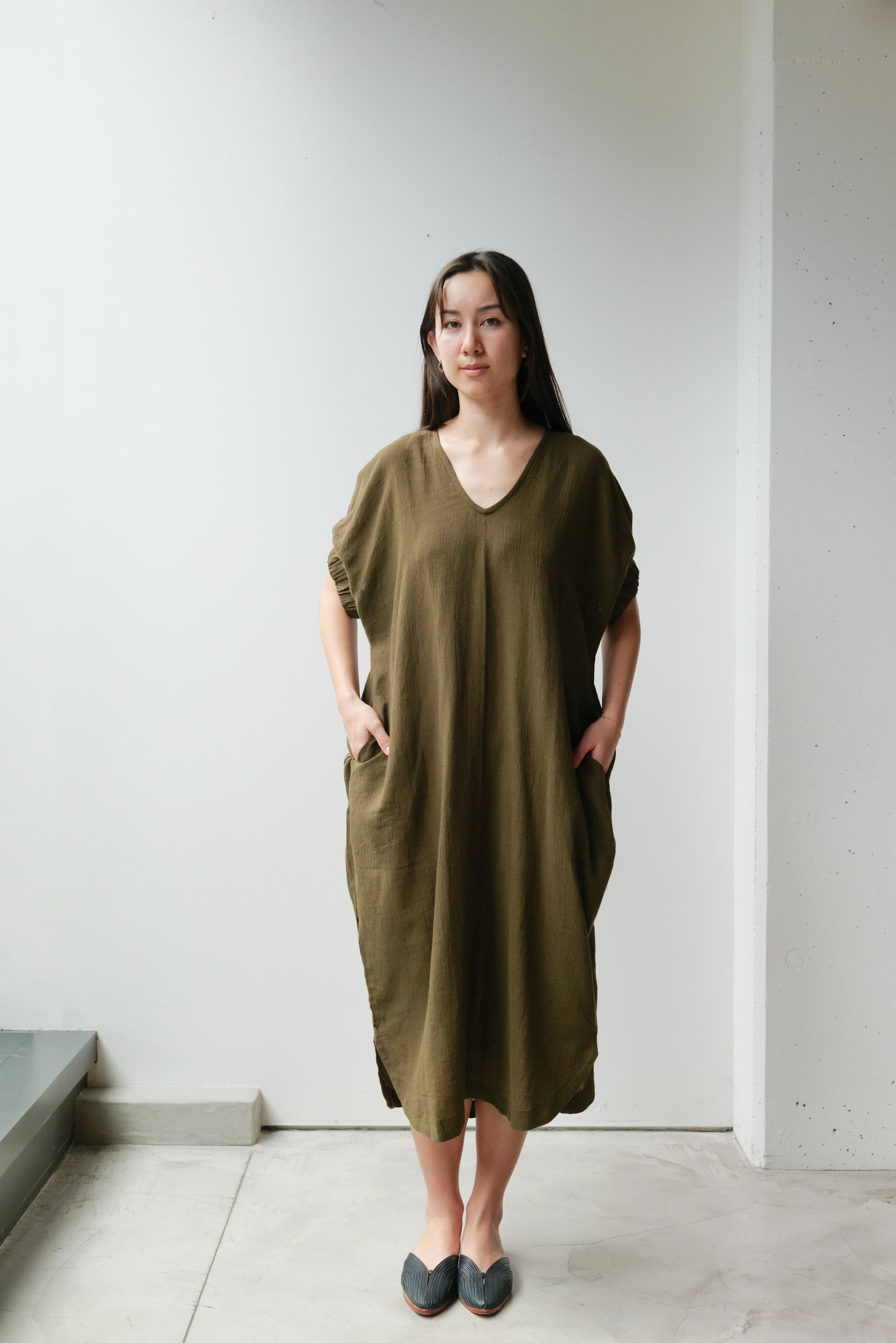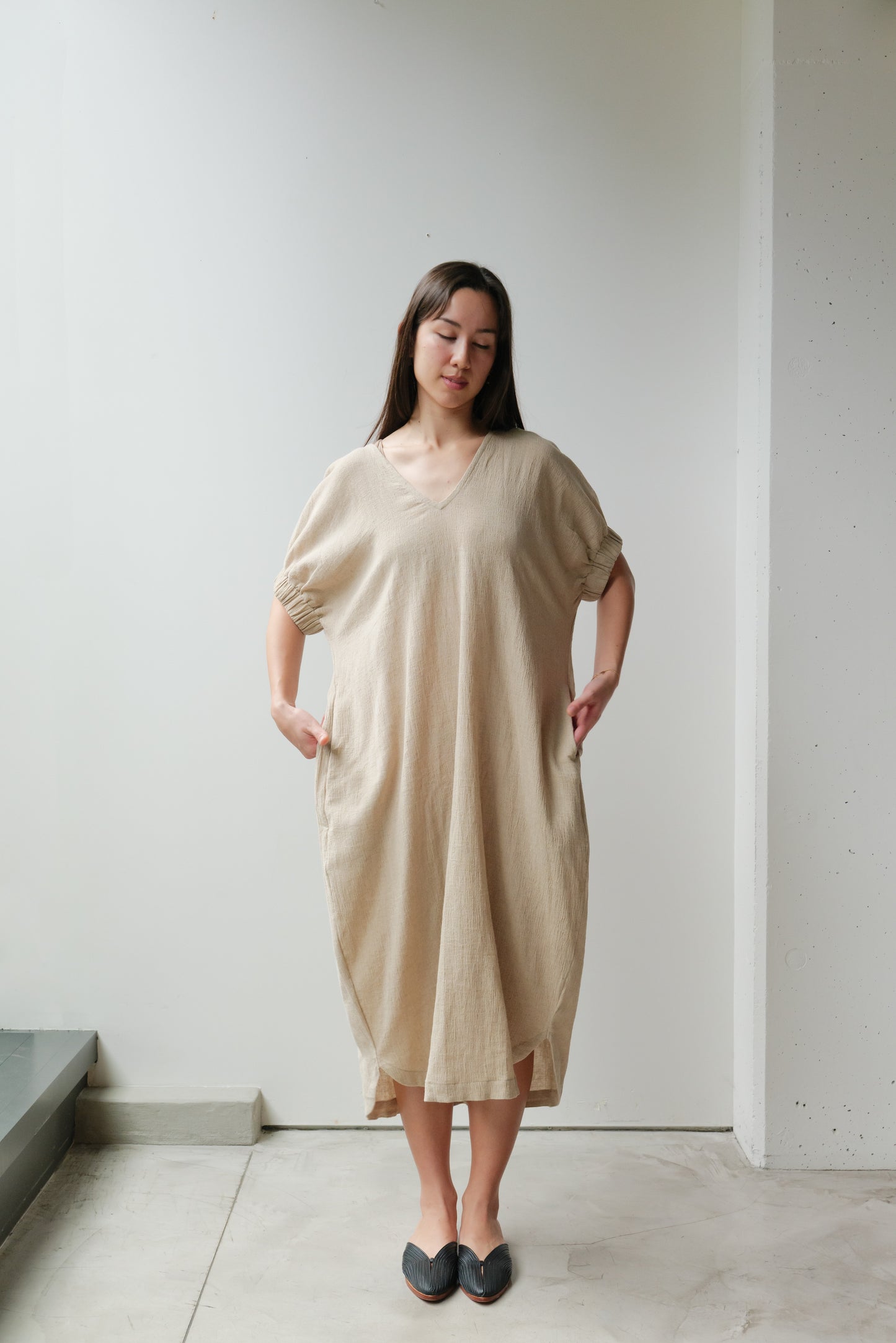 V-neck dress with elastic cuffed sleeves and hidden side pockets. Relax fit.