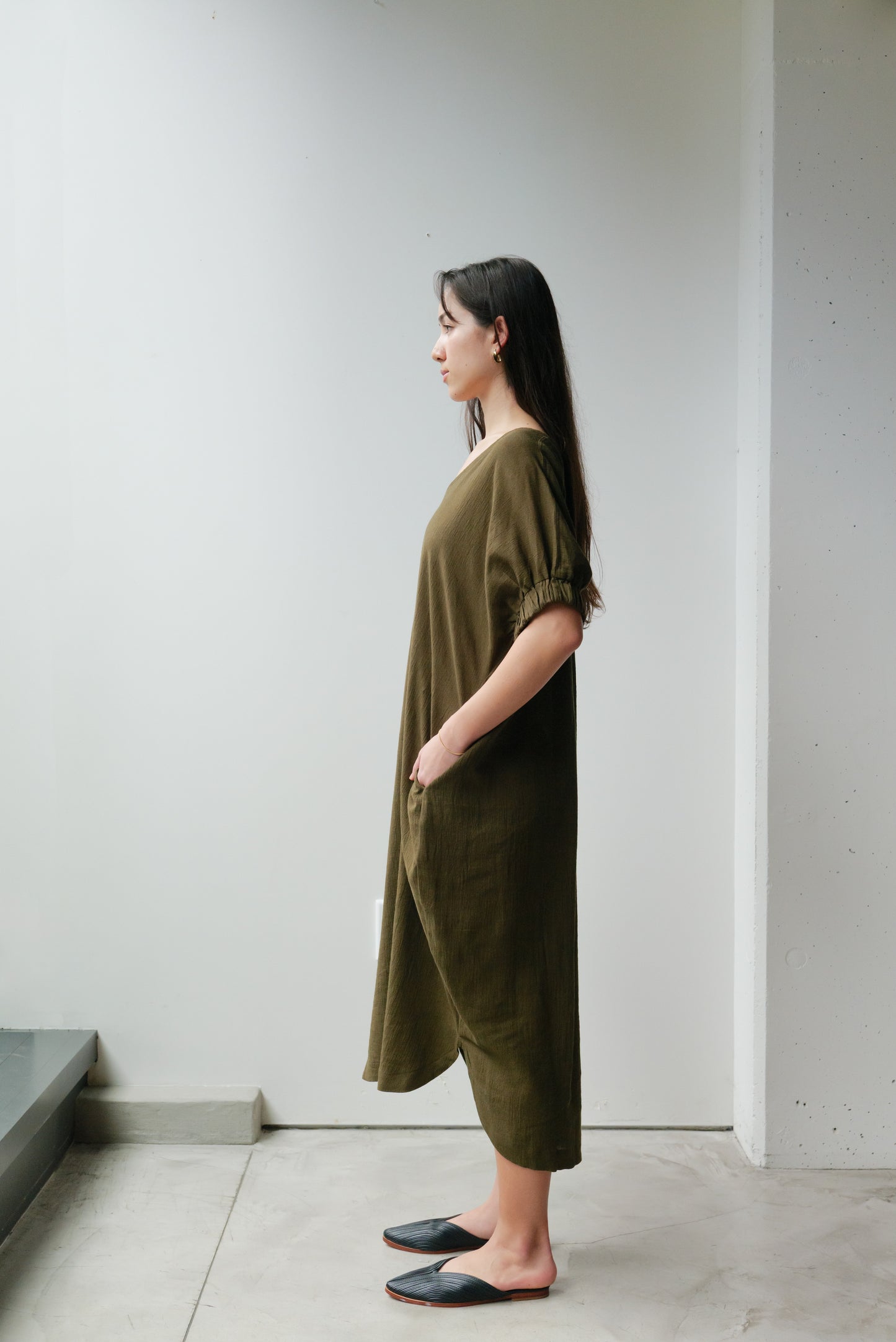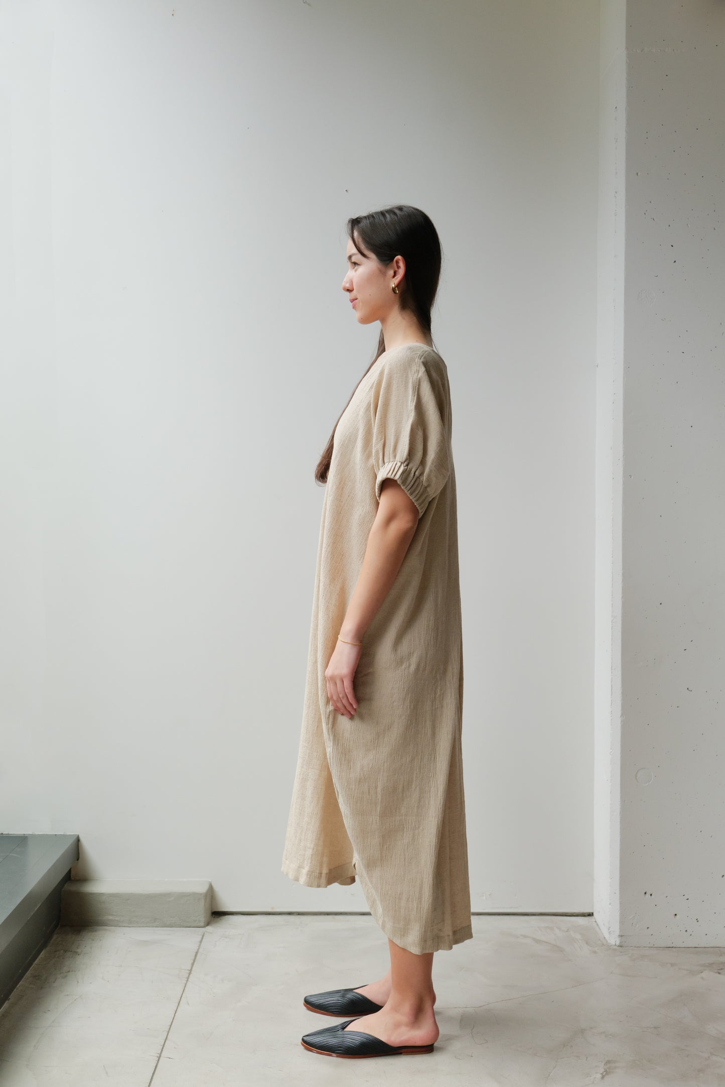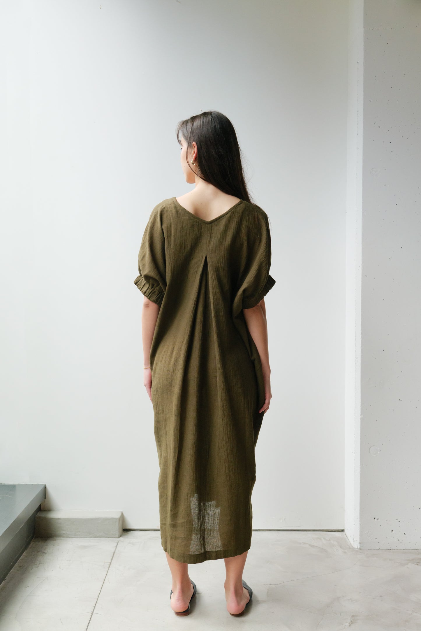 V-neck dress with elastic cuffed sleeves and hidden side pockets. Relax fit.