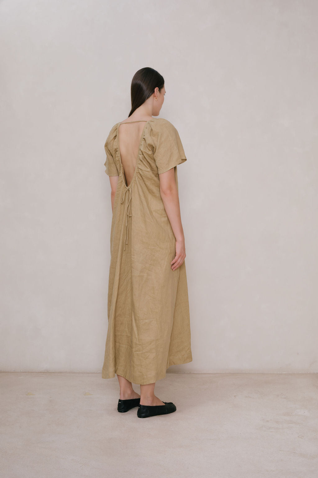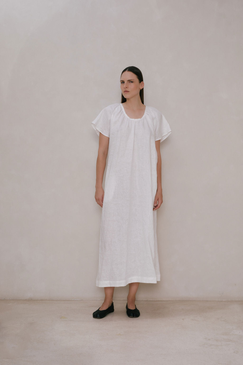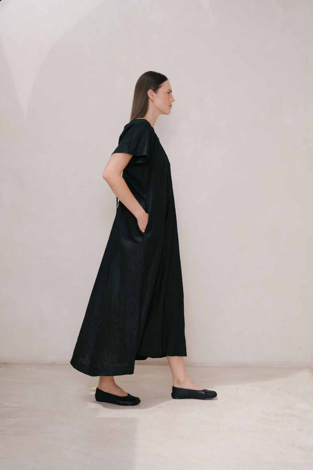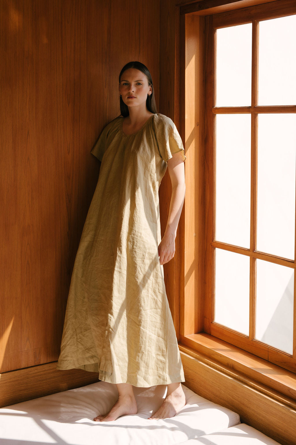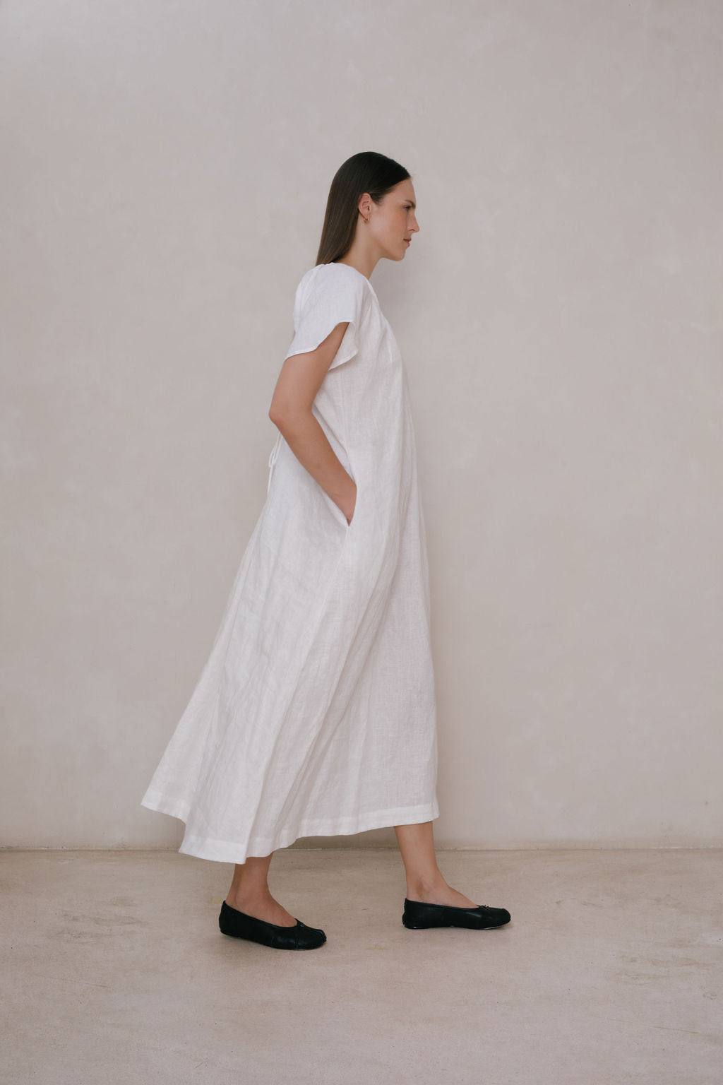 French linen long dress with round neckline and adjustable drawstring opening at back.