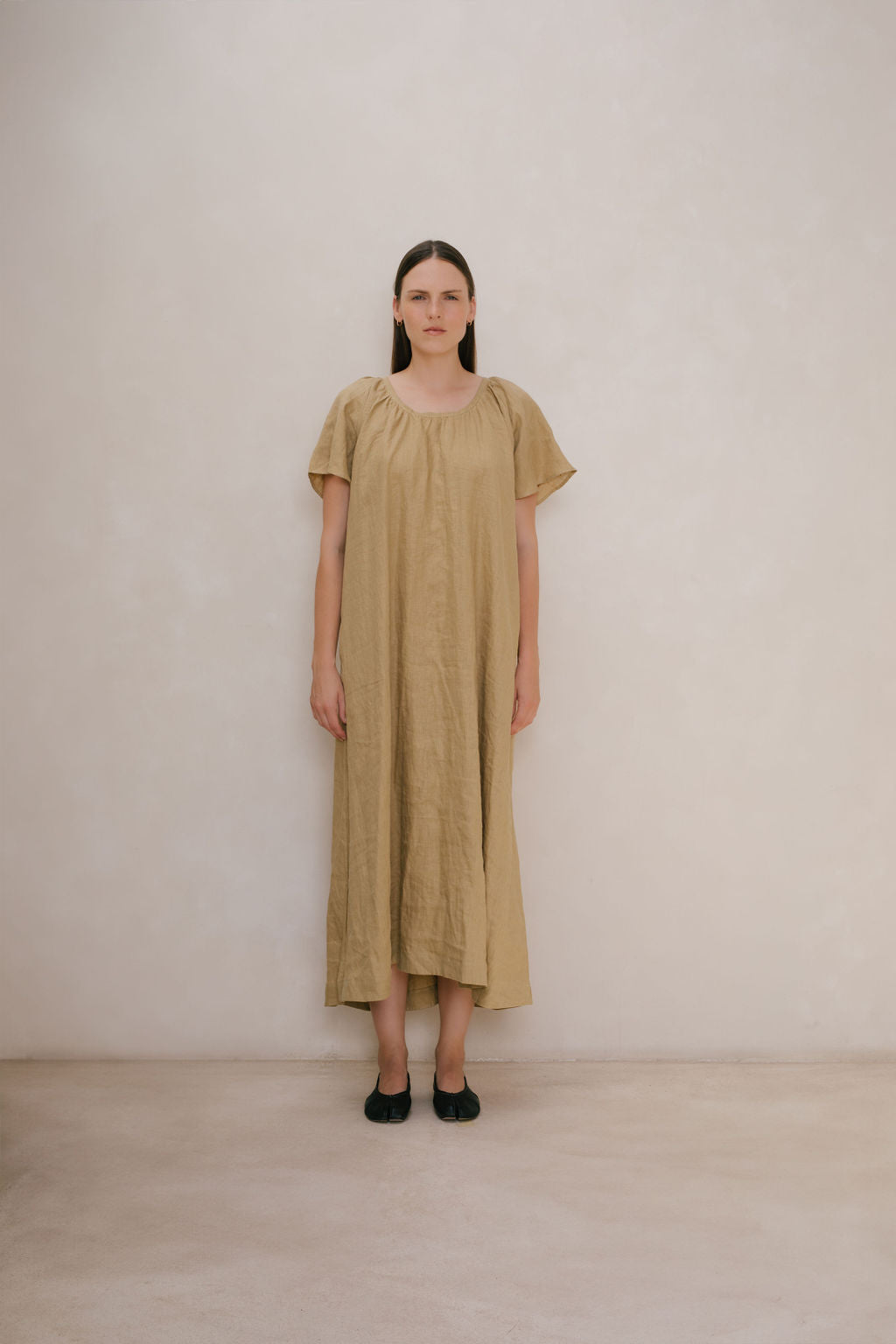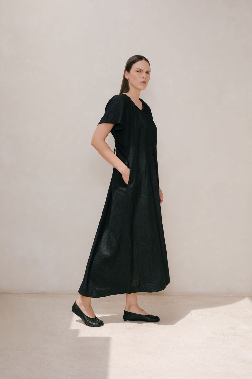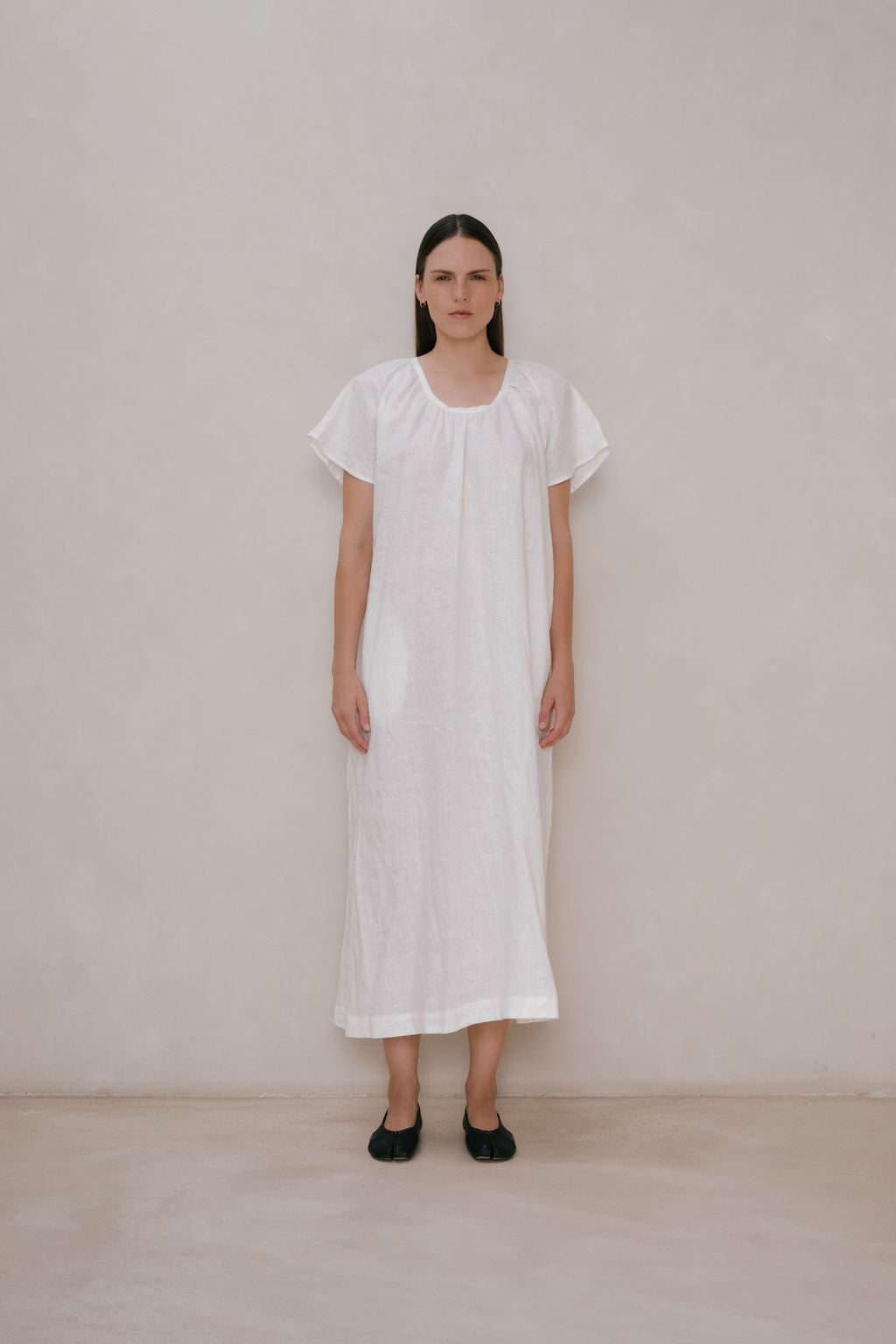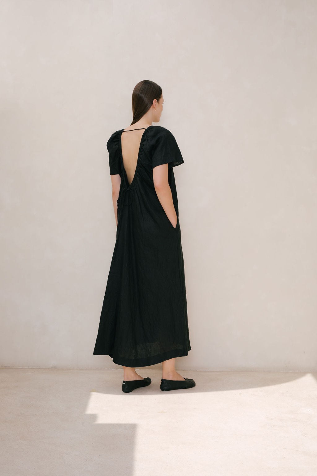 French linen long dress with round neckline and adjustable drawstring opening at back.