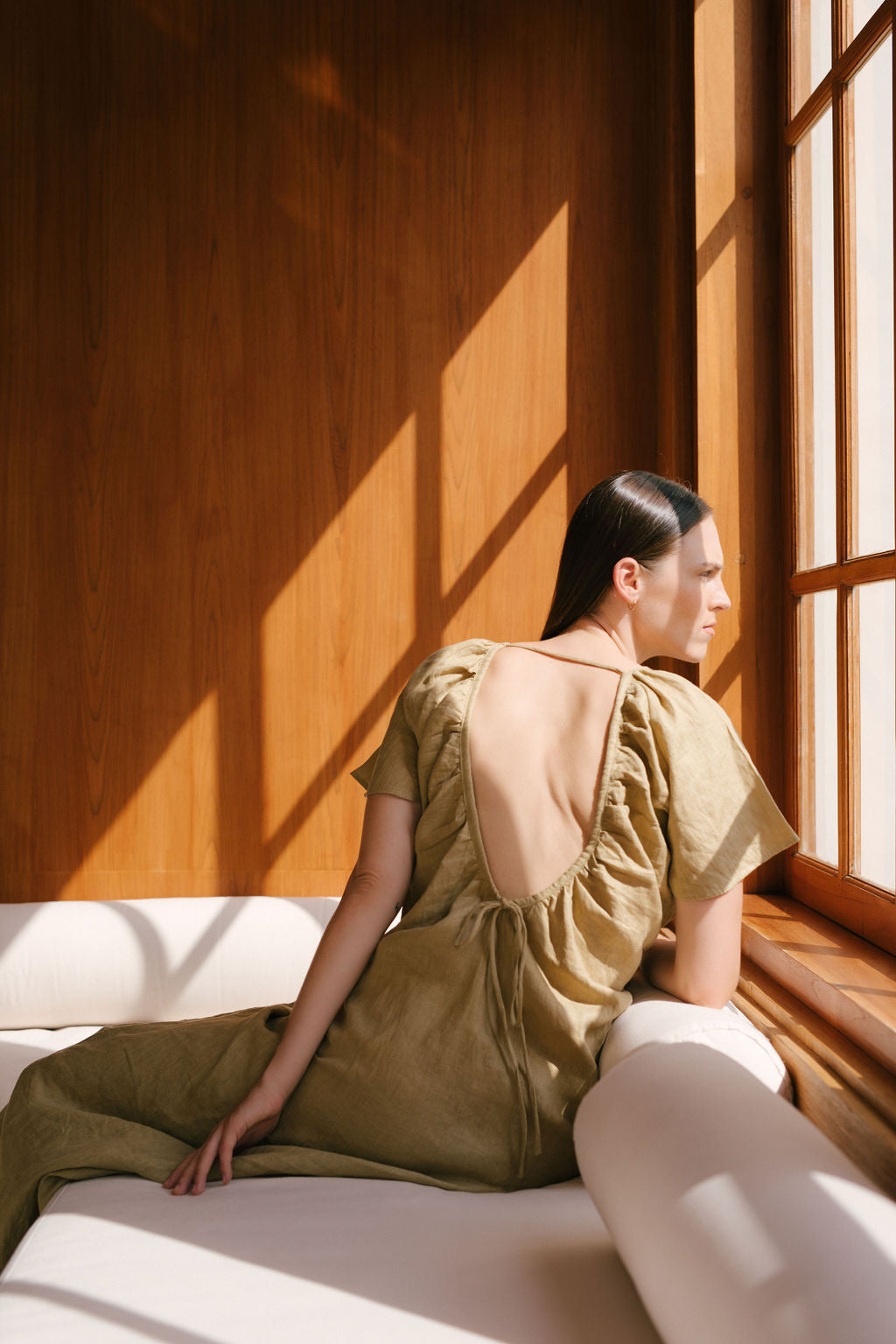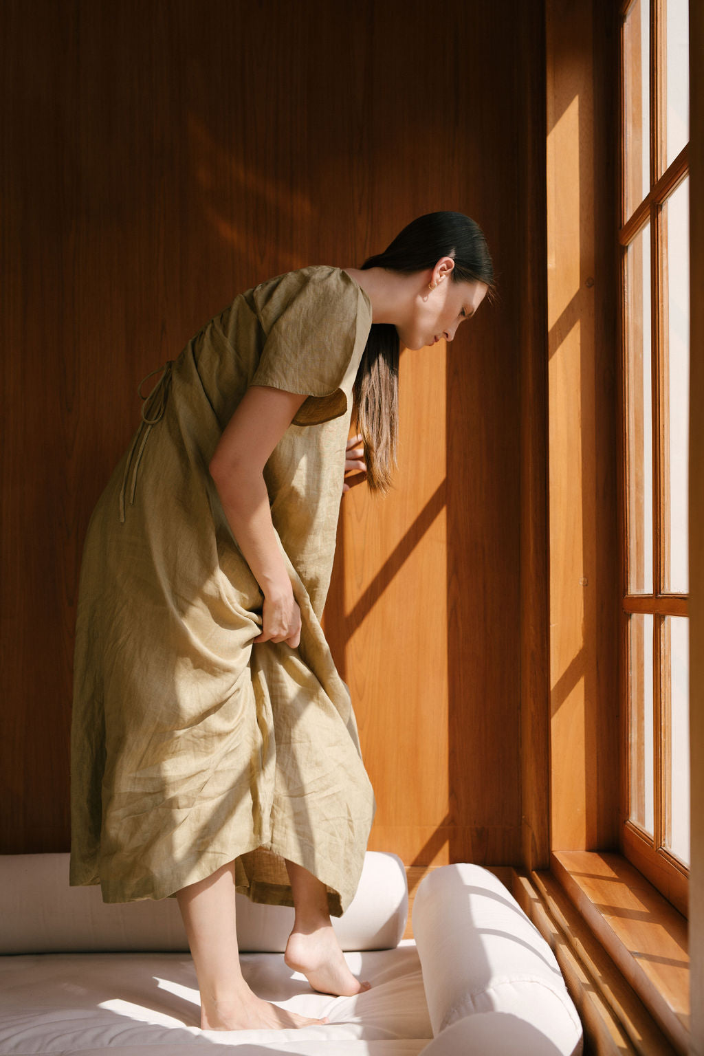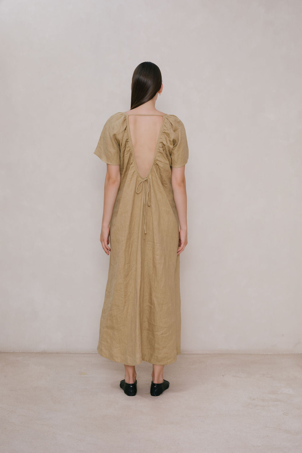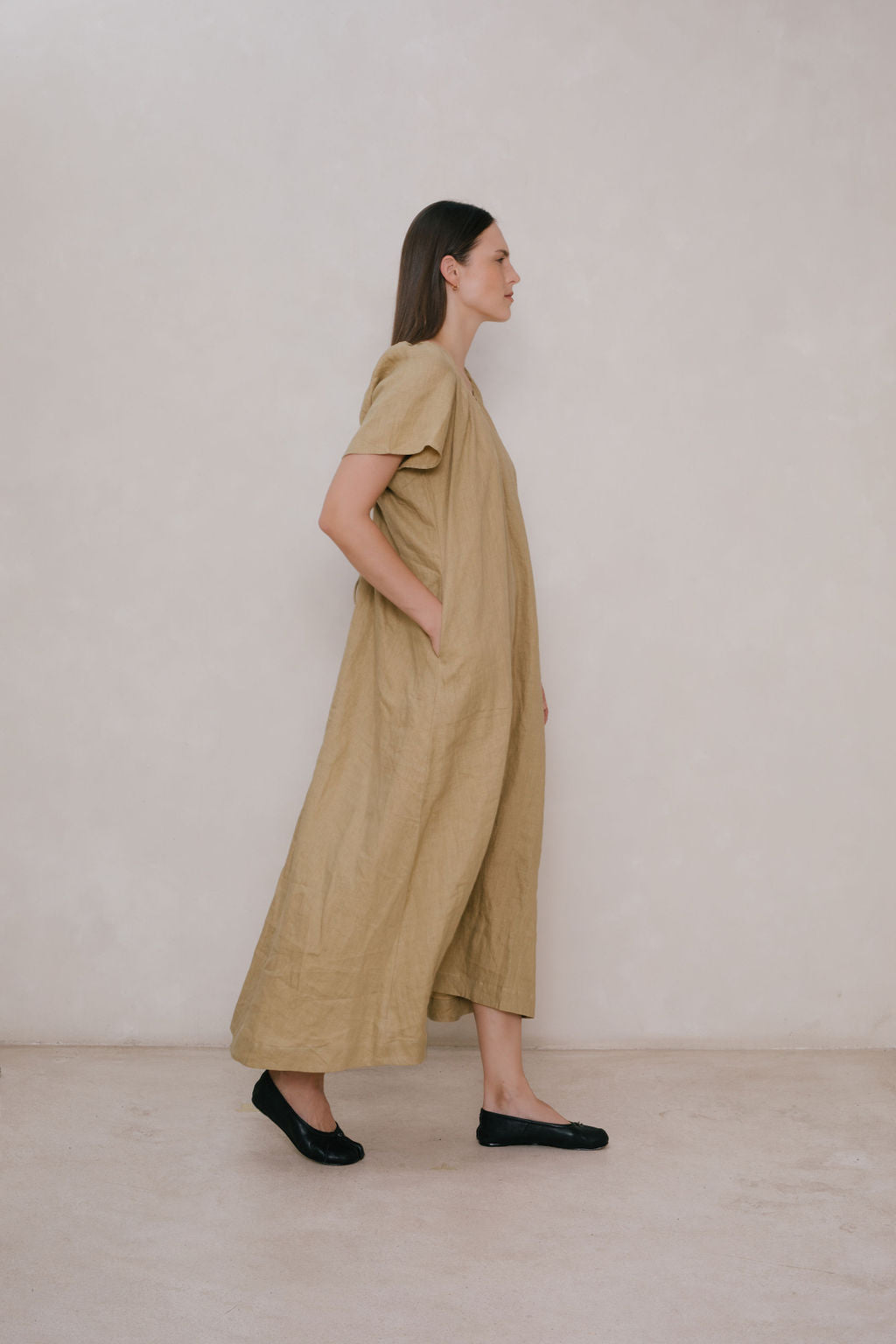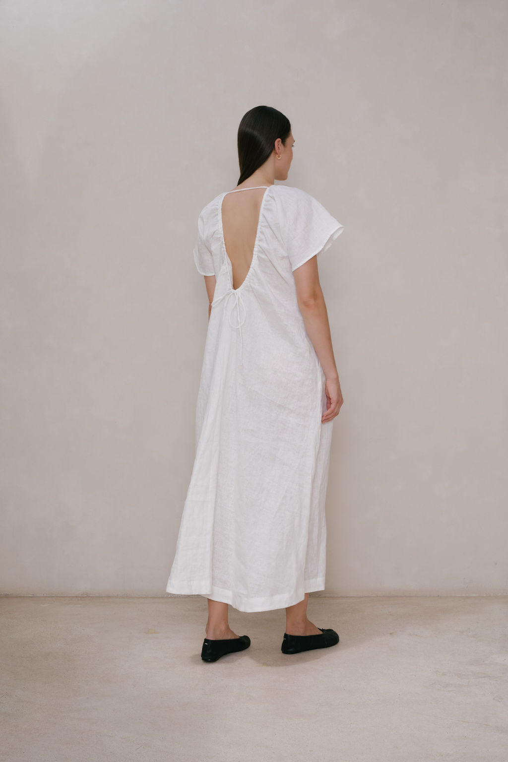 French linen long dress with round neckline and adjustable drawstring opening at back.