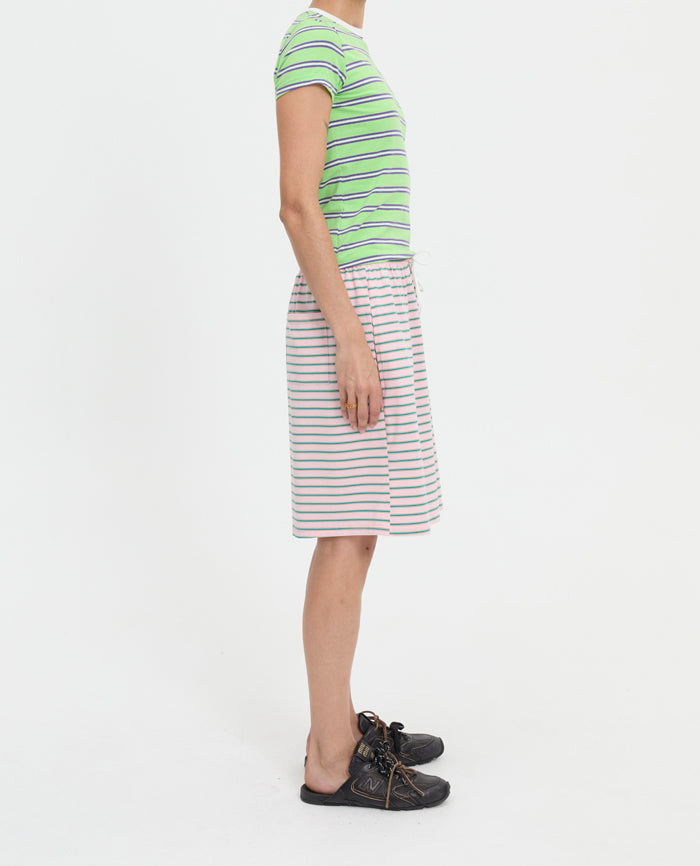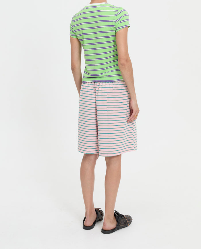 The Cola Tee in Green updates a classic silhouette with subtle colour play. Cut close through the body, it’s crafted from soft stretch cotton for a smooth, comfortable fit. Fine purple stripes run across a bright green base, offset by a clean white neckline. A simple piece with just enough edge.